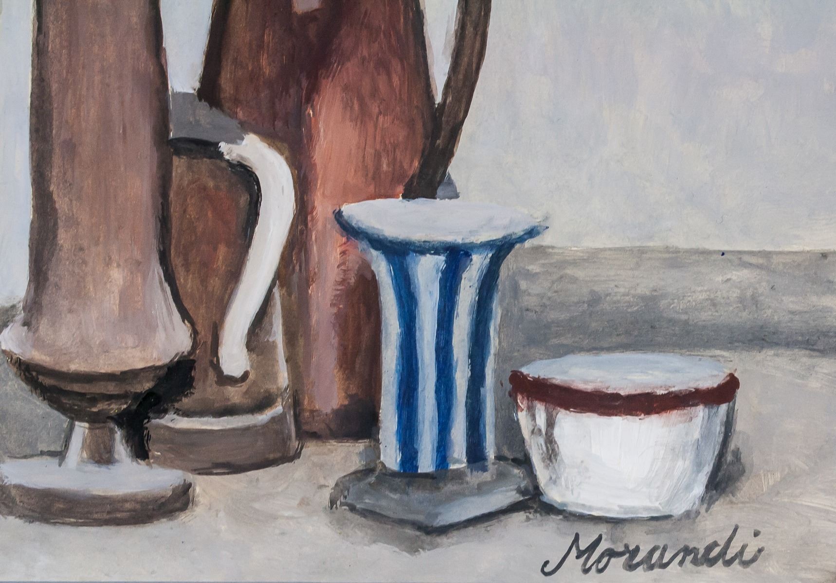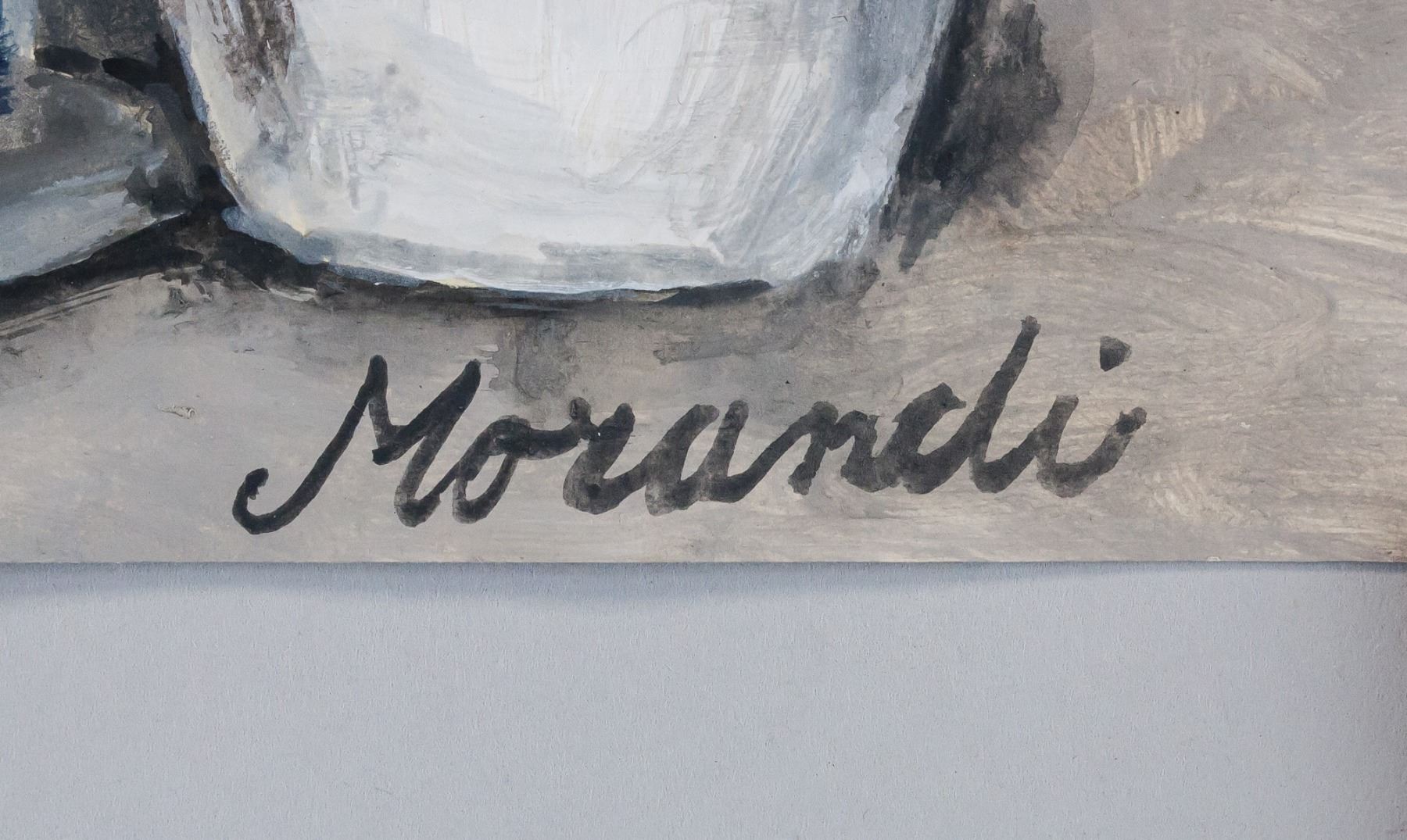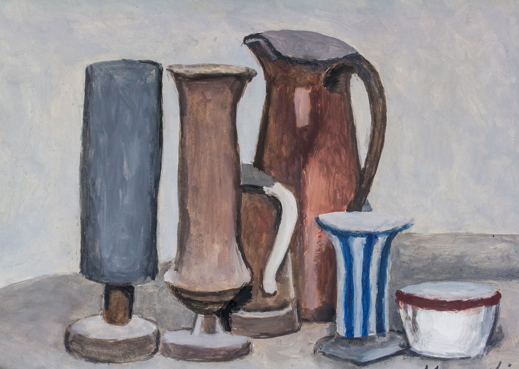 Gouache on paper. Featuring a modernist still of vases, candle holders and milk jugs with cups. Signed Morandi on the lower right corner. Inscribed Giorgio Morandi 52 in pencil and stamped Charles Egan NY, verso. Attributed to Giorgio Morandi (1890-1964, Italian). 19.5 x 28 cm (7.25 x 11 in). PROVENANCE: This lot carries limited provenance from a Southern Ontario estate