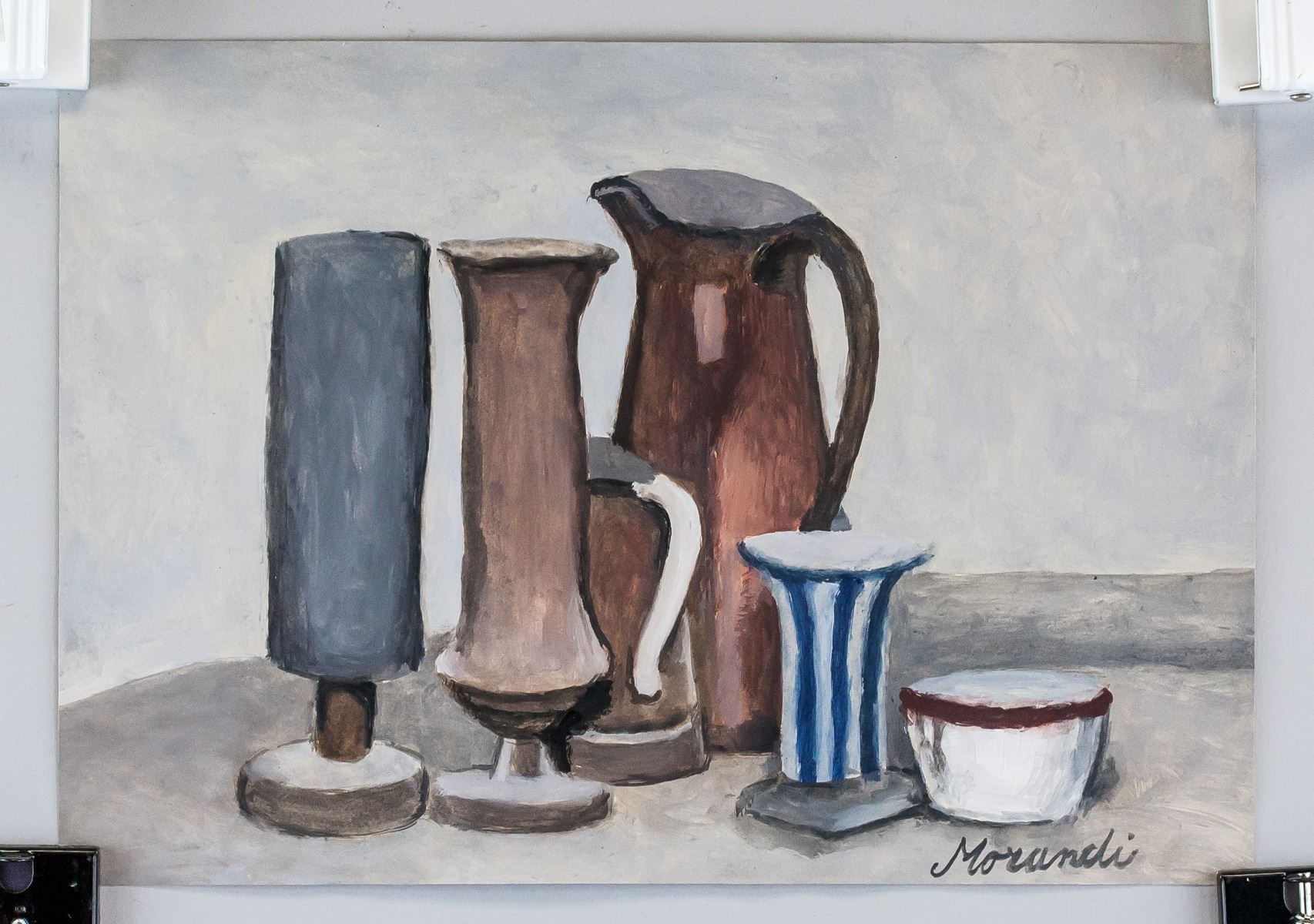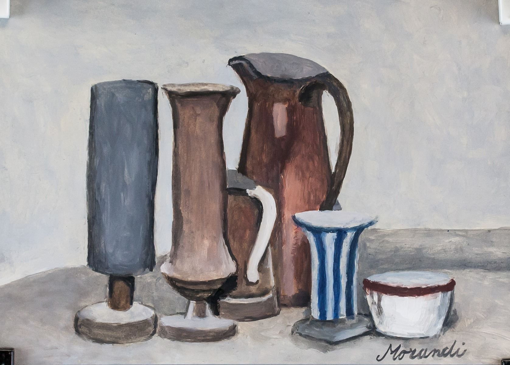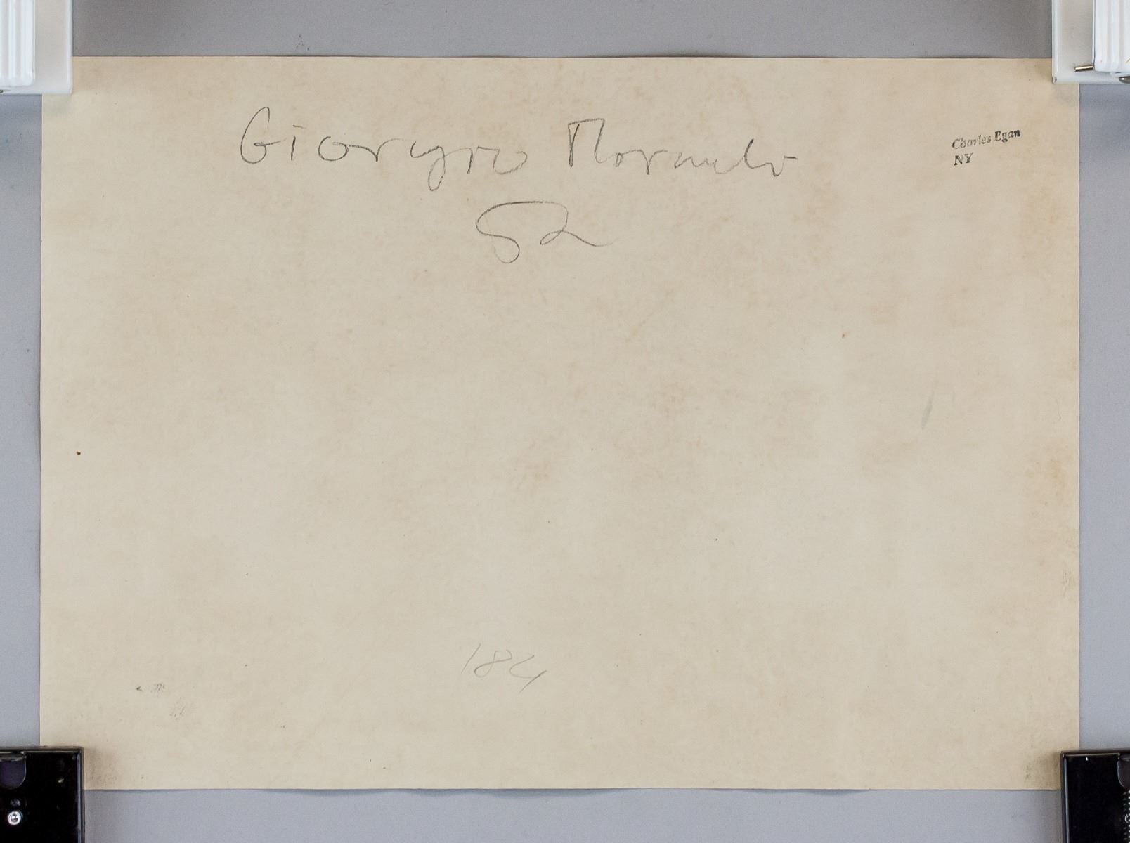 Gouache on paper. Featuring a modernist still of vases, candle holders and milk jugs with cups. Signed Morandi on the lower right corner. Inscribed Giorgio Morandi 52 in pencil and stamped Charles Egan NY, verso. Attributed to Giorgio Morandi (1890-1964, Italian). 19.5 x 28 cm (7.25 x 11 in). PROVENANCE: This lot carries limited provenance from a Southern Ontario estate