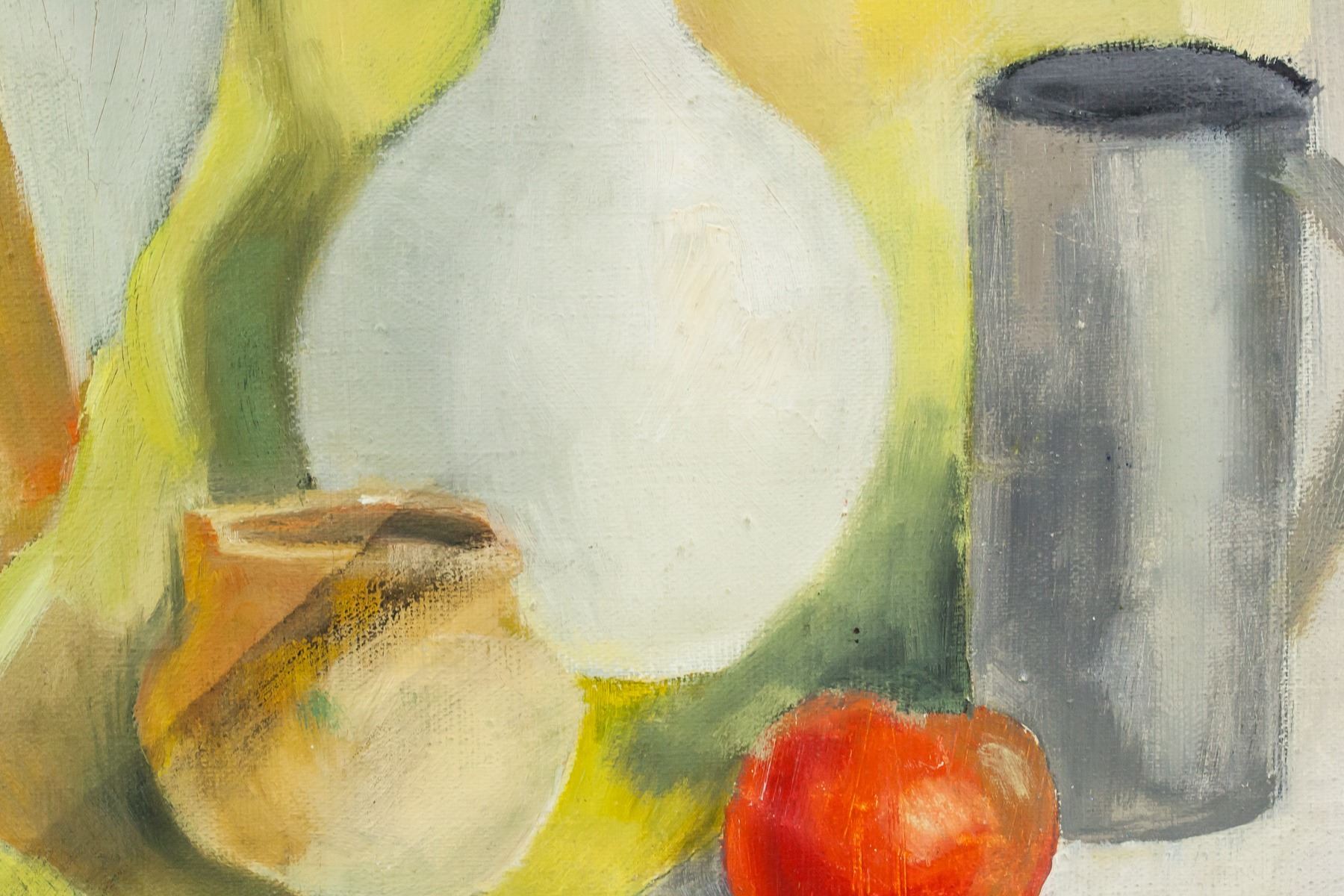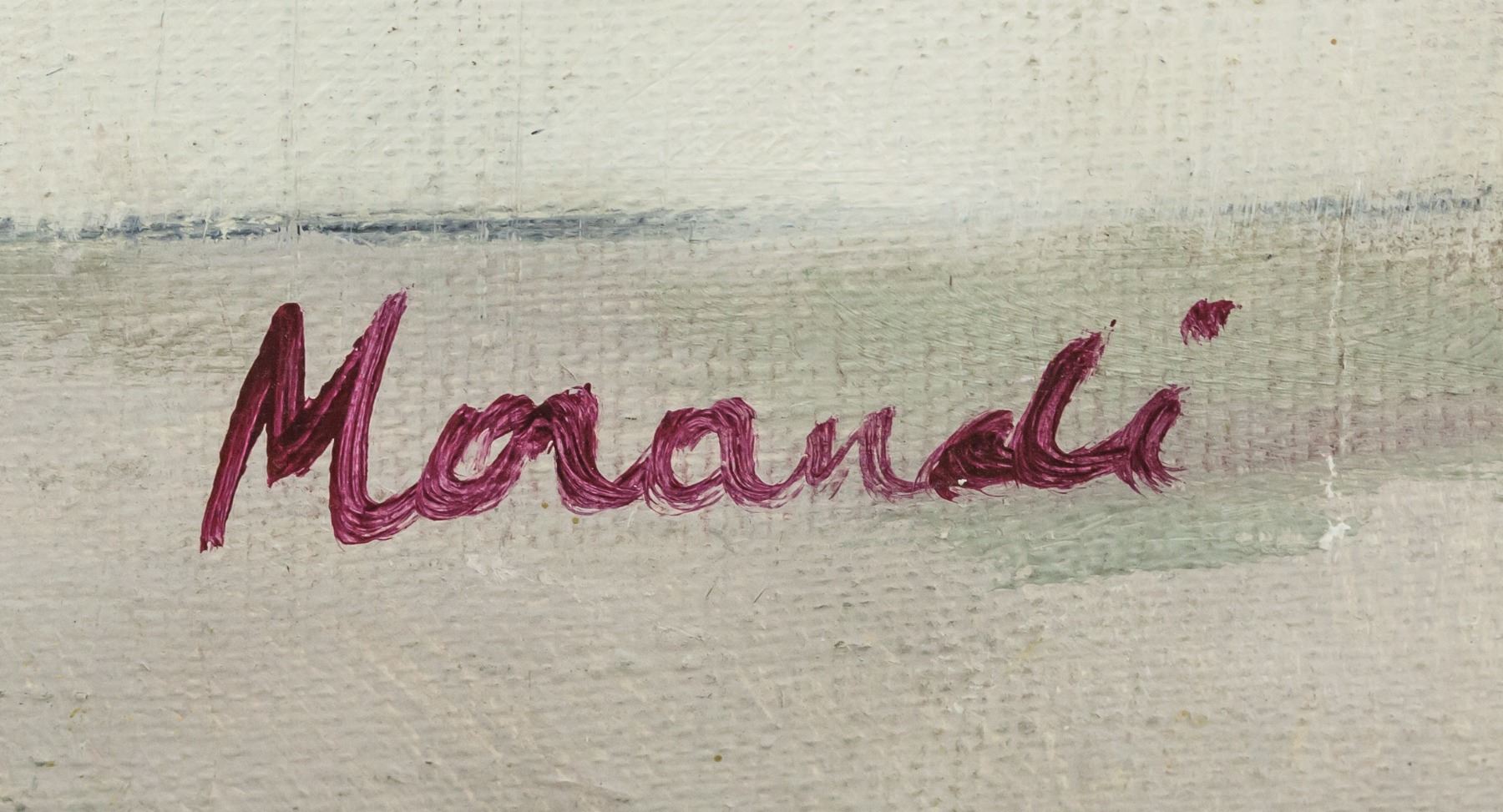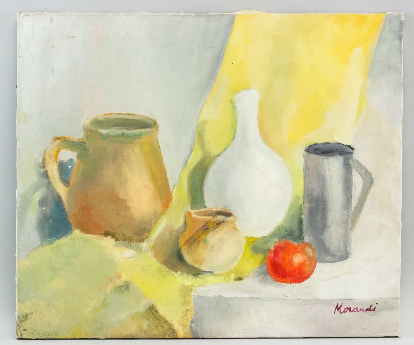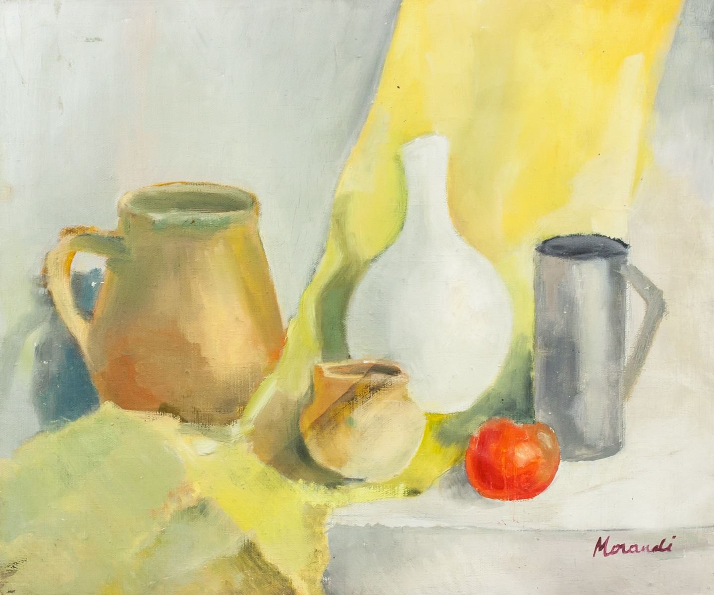 Oil on canvas. Featuring still-life of jugs and a tomato. Signed "Morandi" in the bottom right corner. Attributed to Giorgio Morandi (1890-1964, Italian). 47 x 55 cm (18.5 x 21.75 in). Provenance: This lot carries limited provenance from a Southern Ontario estate