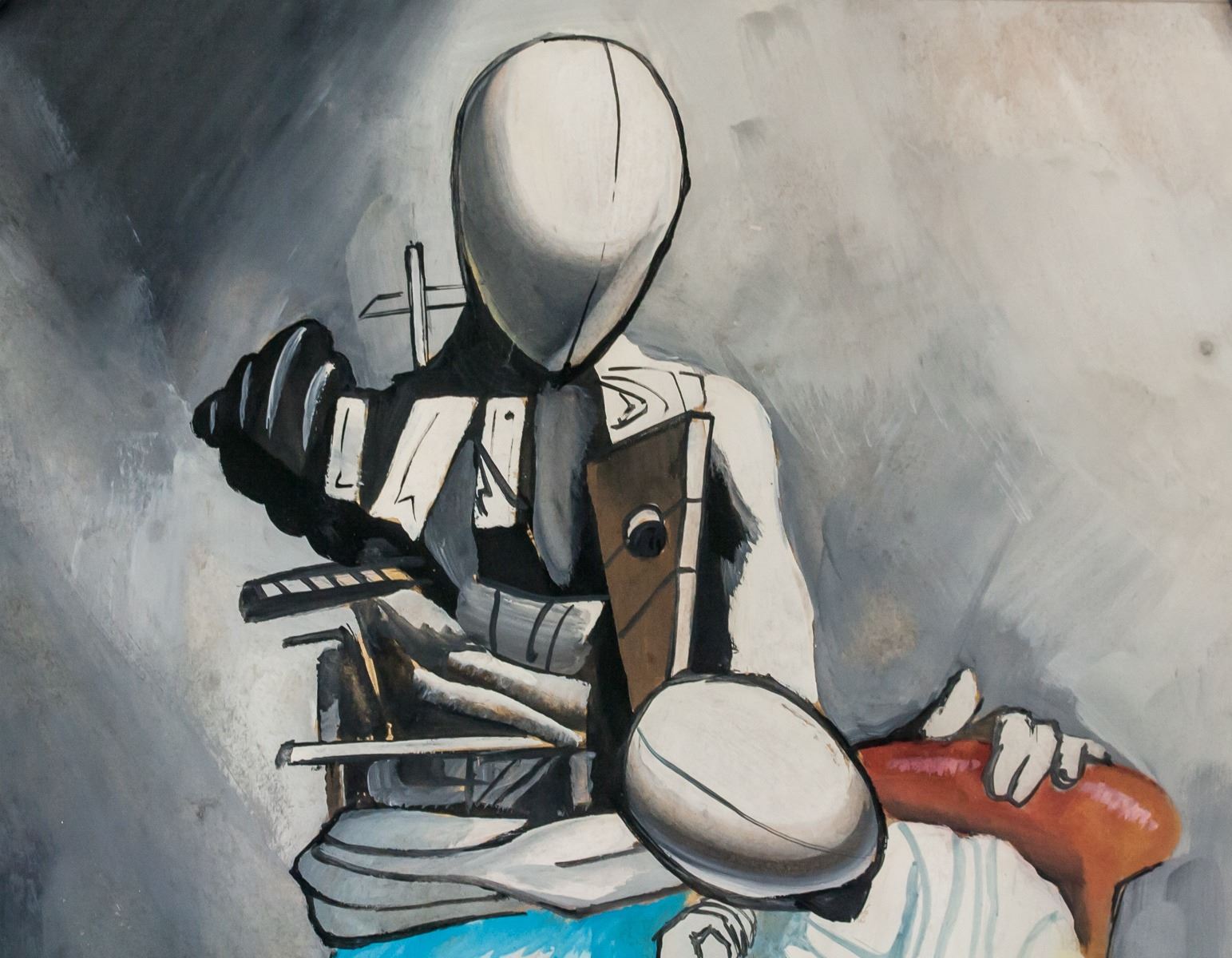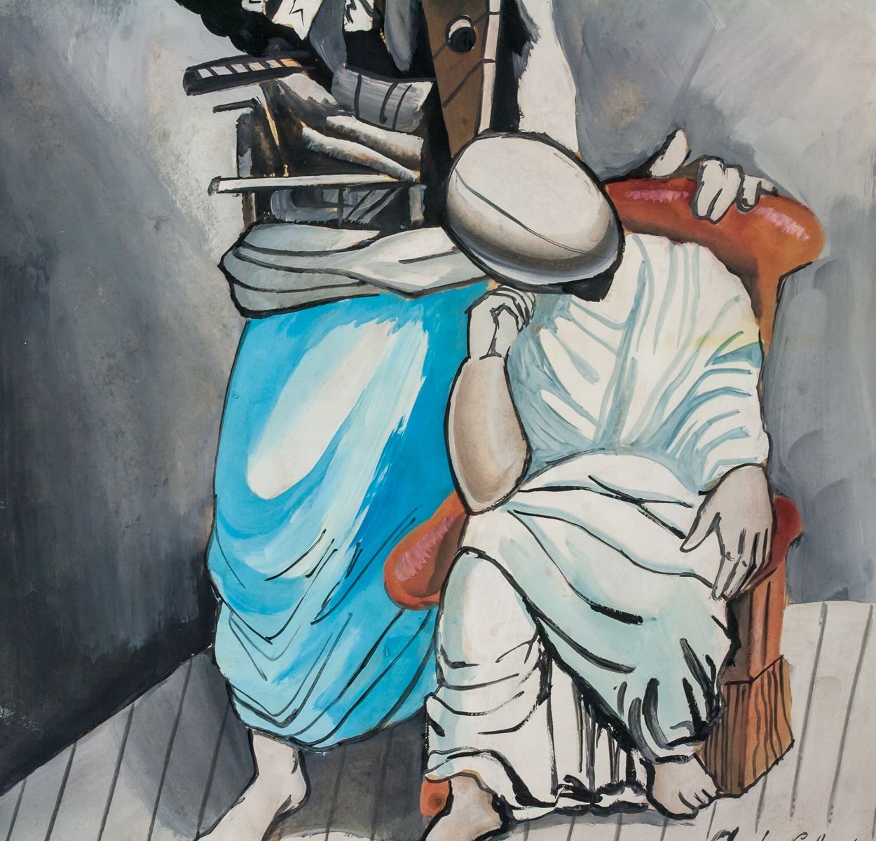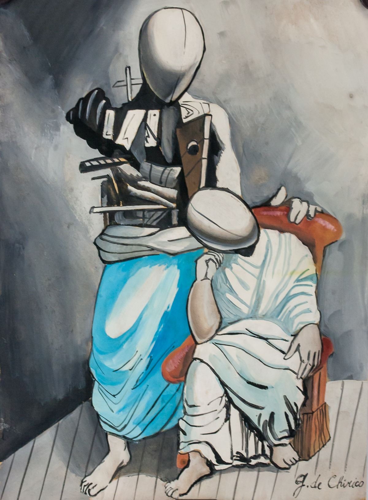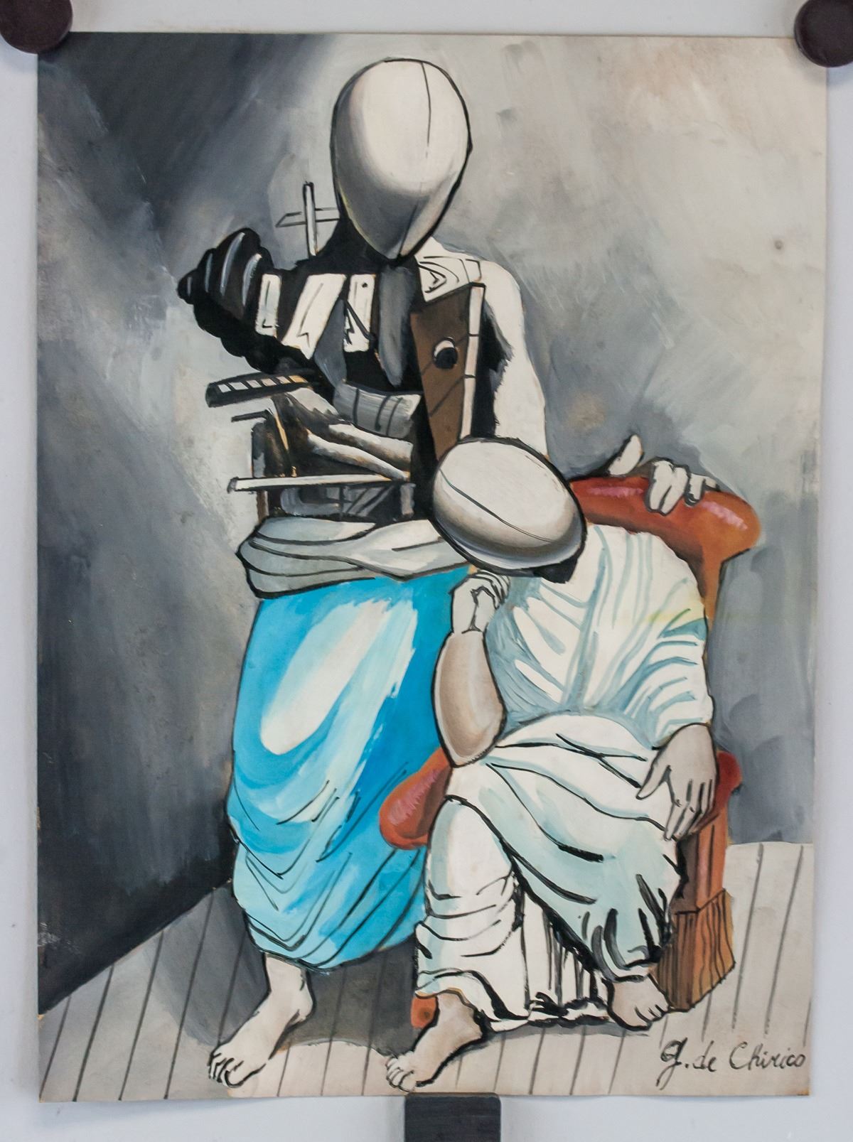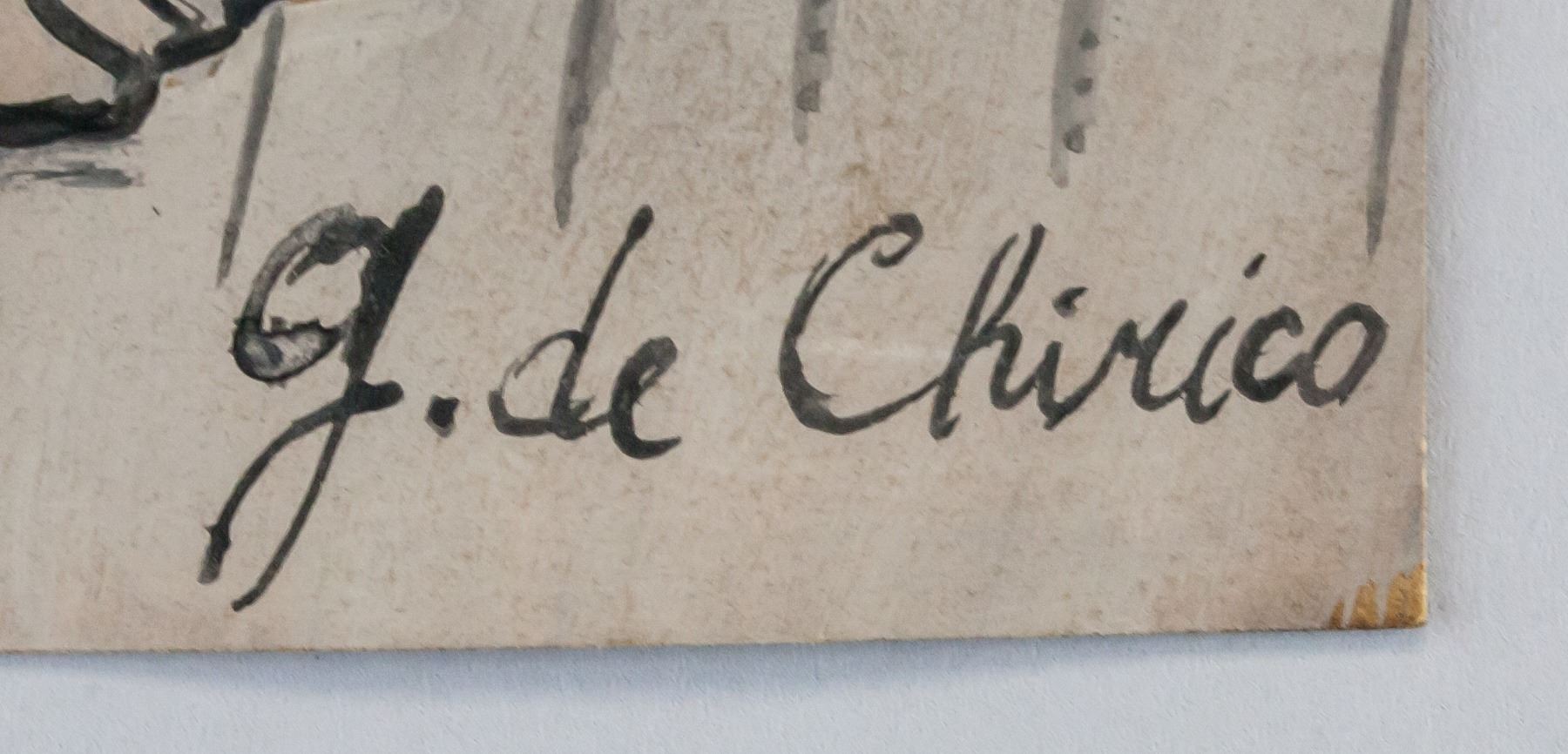 Gouache on paper. Featuring a scene of surrealist figure. Signed G. de Chirico on the lower right corner. Attributed to Giorgio de Chirico (1888-1978, Italian). 26 x 19 cm (10.2 x 7.5 inches). PROVENANCE: Southern Ontario estate