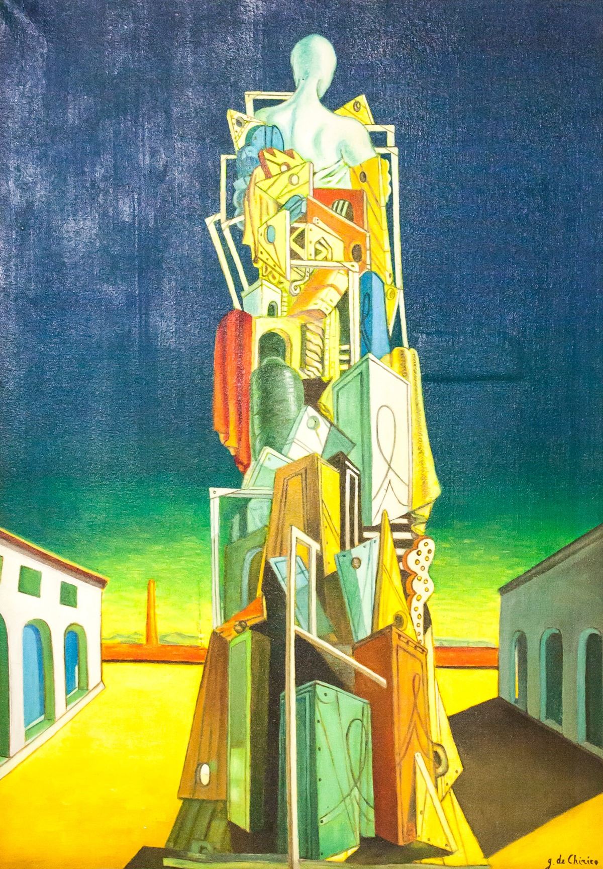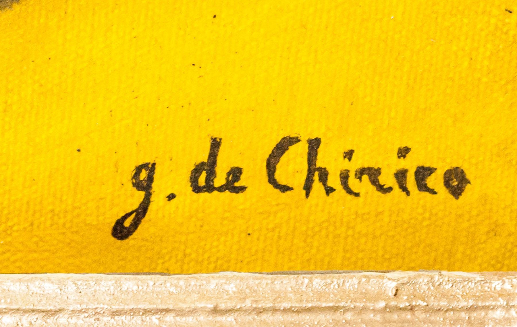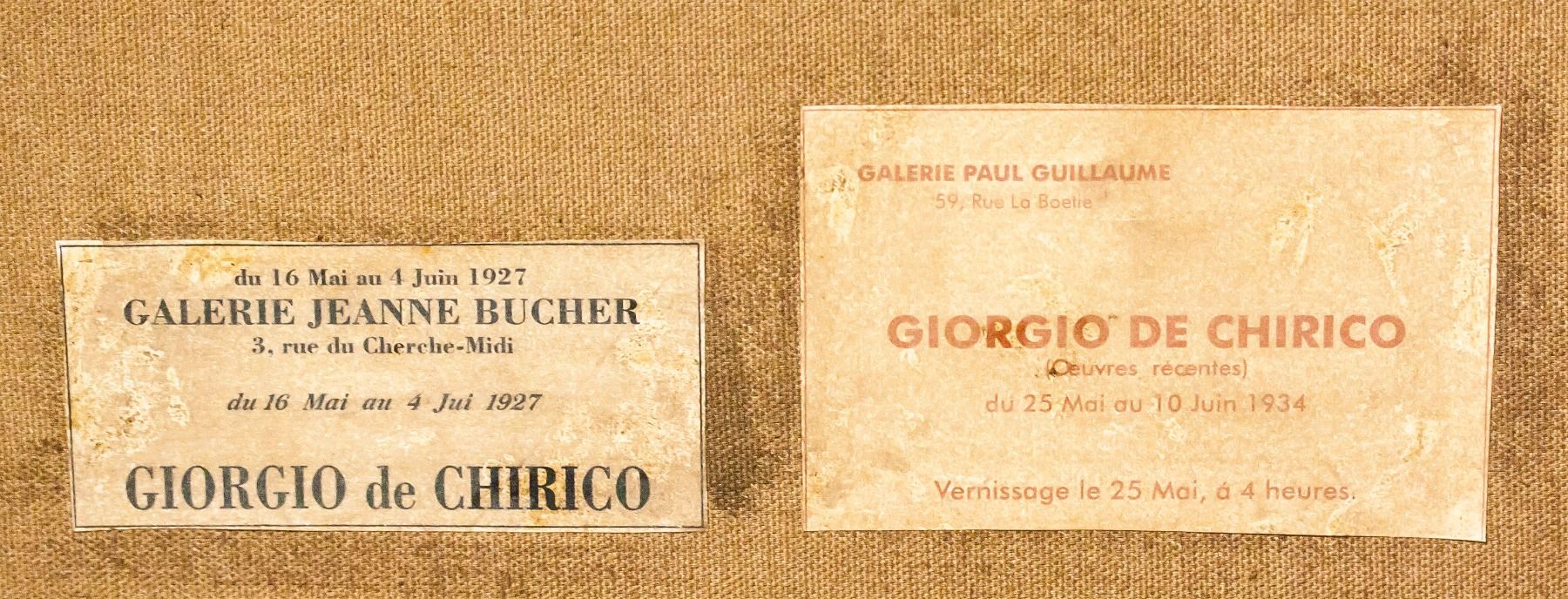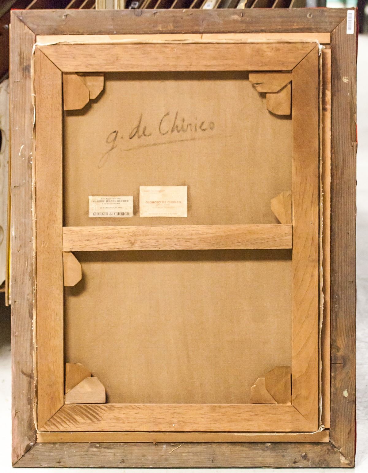 Oil on canvas, framed. Featuring surrealist composition of a tower constructed of cabinets and odd items. Signed "g. de. Chirico" in the bottom right corner. "g. de. Chirico" inscribed on verso. Two labels on verso read "GALERIE JEANNE BUCHER" and "GALERIE PAUL GUILLAUME". Attributed to Giorgio de Chirico (1888-1978, Italian). Canvas size: 75 x 55 cm (29.5 x 21.6 inches). Frame size: 89 x 67 cm (35 x 26.5 inches).