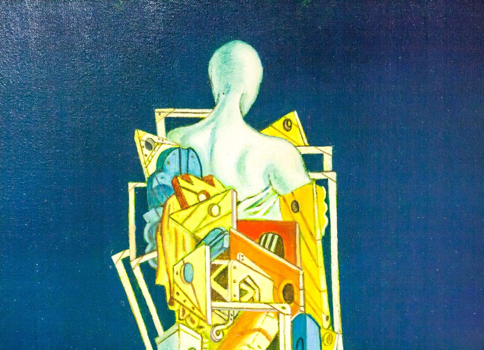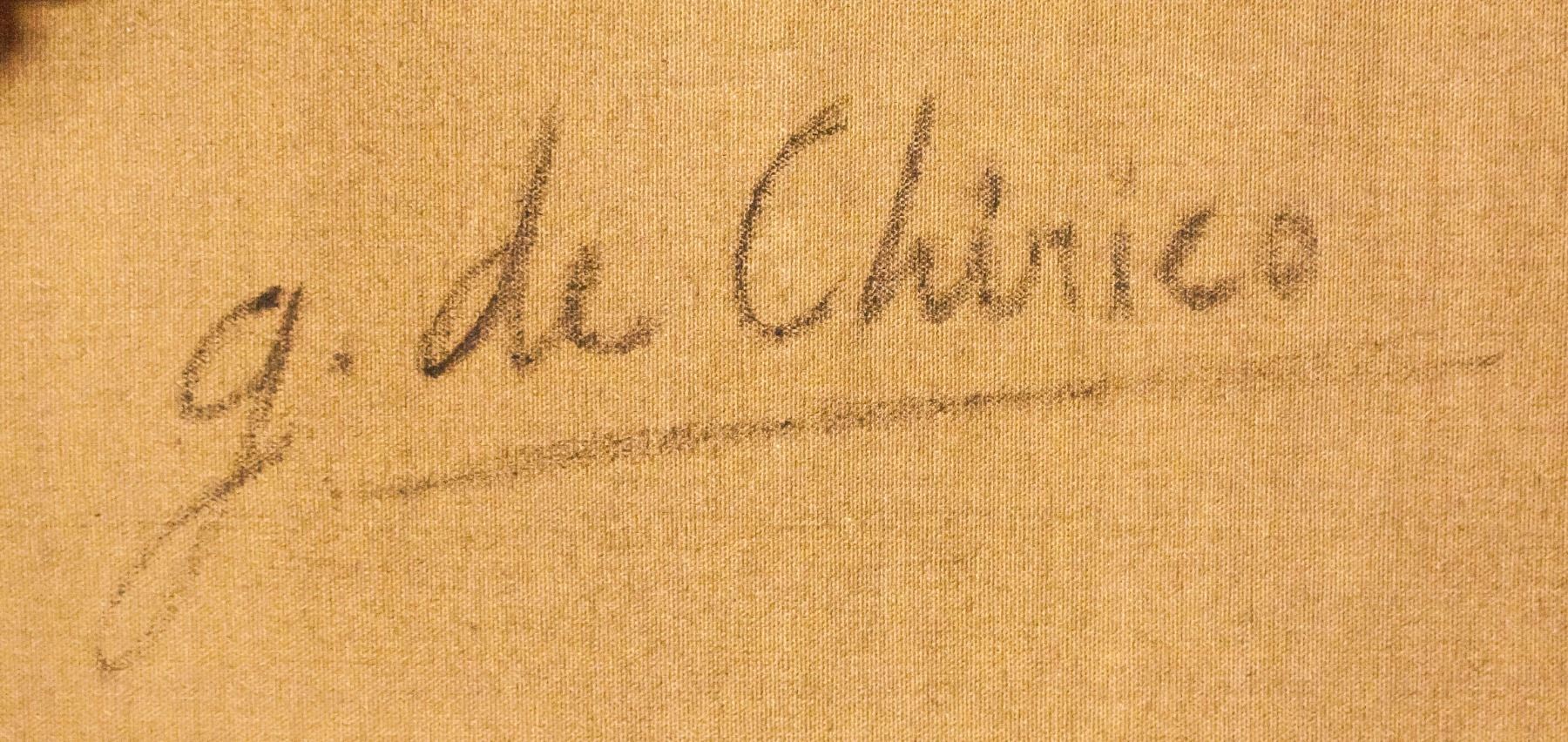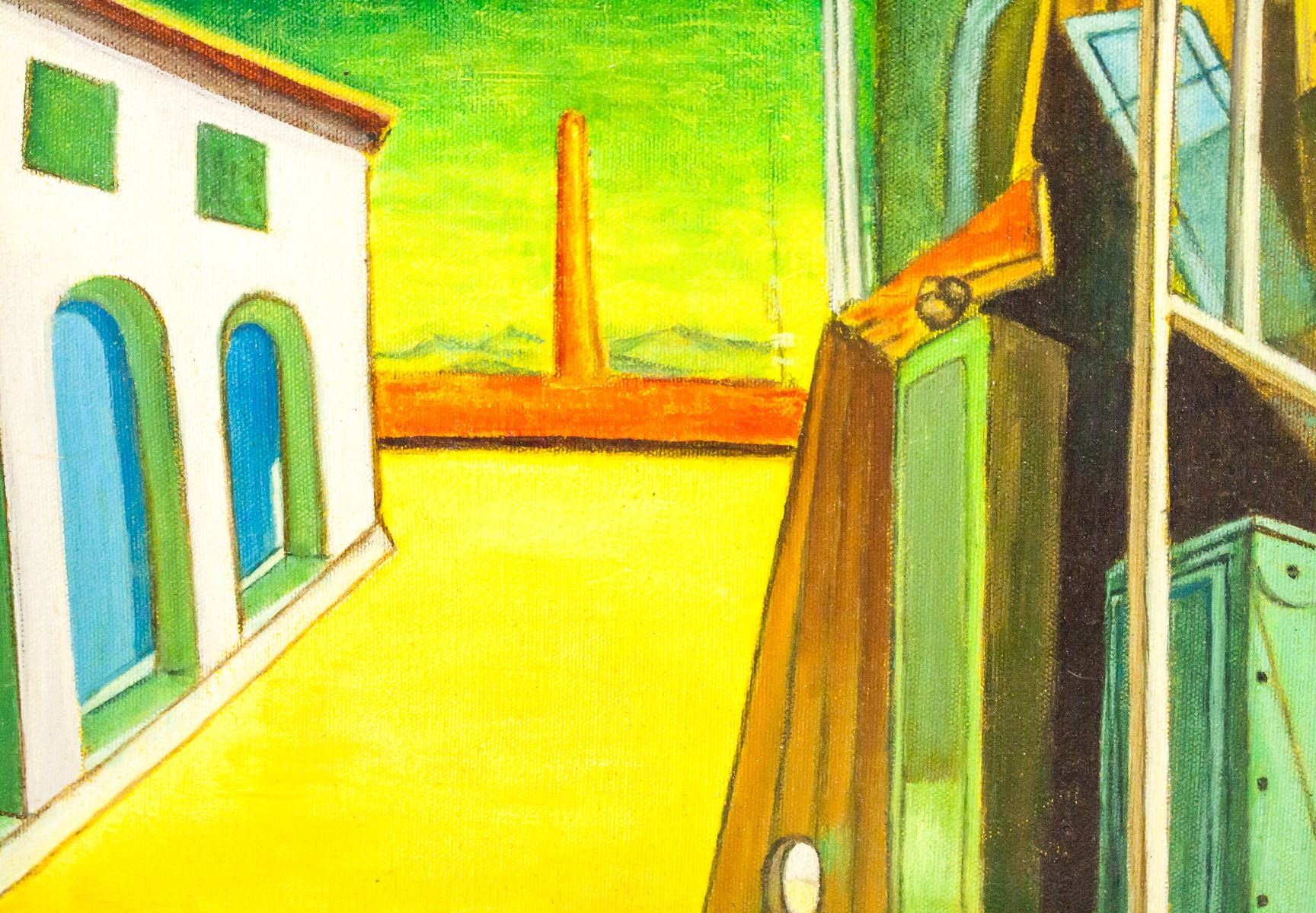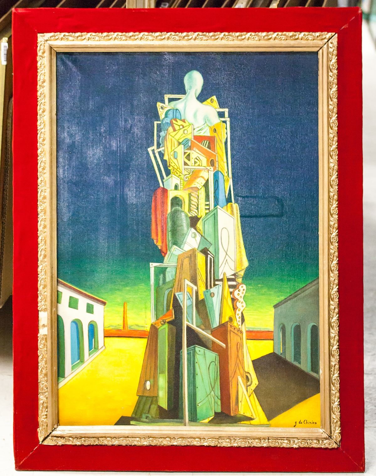 Oil on canvas, framed. Featuring surrealist composition of a tower constructed of cabinets and odd items. Signed "g. de. Chirico" in the bottom right corner. "g. de. Chirico" inscribed on verso. Two labels on verso read "GALERIE JEANNE BUCHER" and "GALERIE PAUL GUILLAUME". Attributed to Giorgio de Chirico (1888-1978, Italian). Canvas size: 75 x 55 cm (29.5 x 21.6 inches). Frame size: 89 x 67 cm (35 x 26.5 inches).