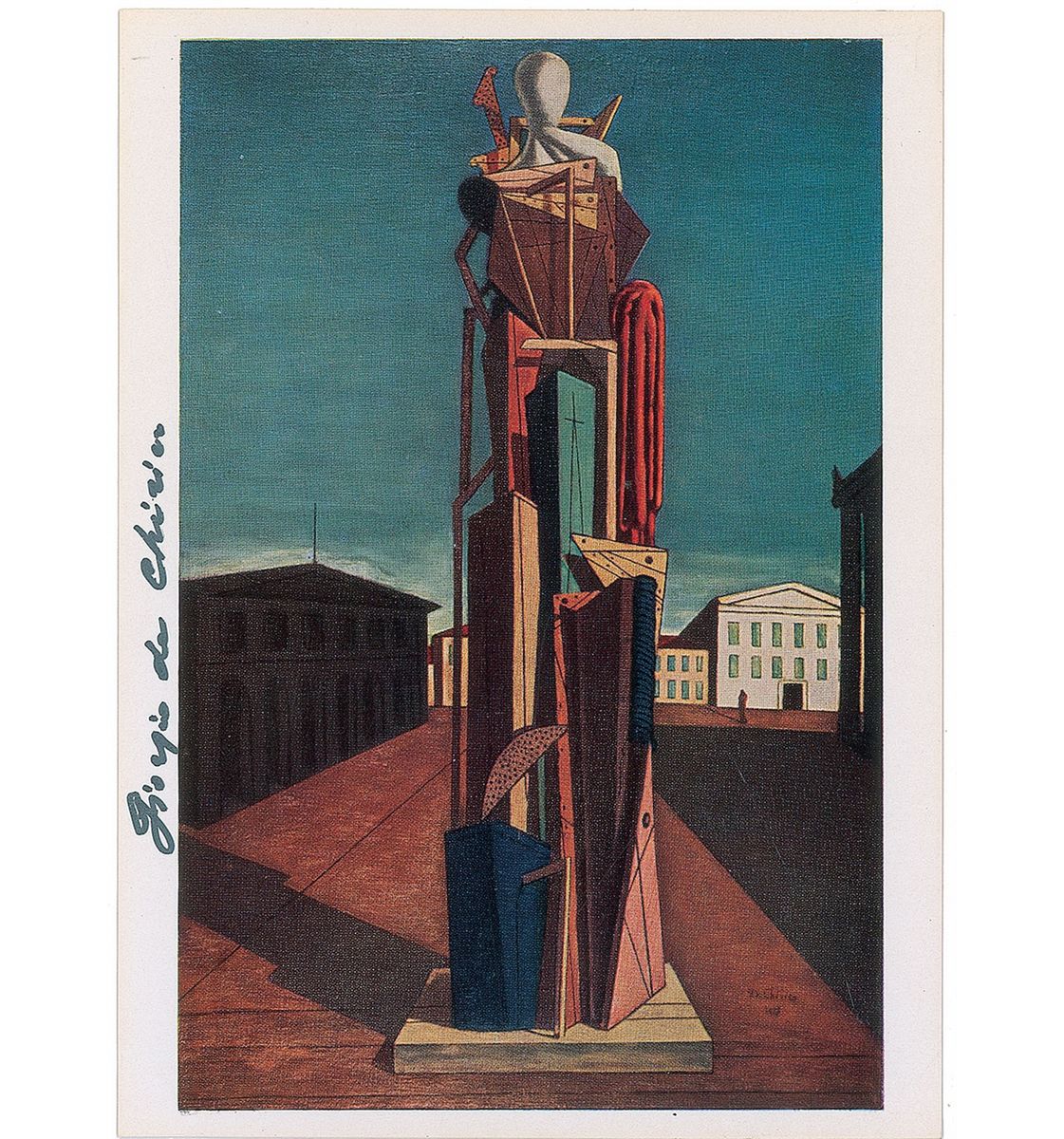Color postcard of Chirico’s 1917 work entitled ‘The Great Metaphysician,’ 4.5 x 6, signed vertically in the left border in black felt tip. In fine condition.