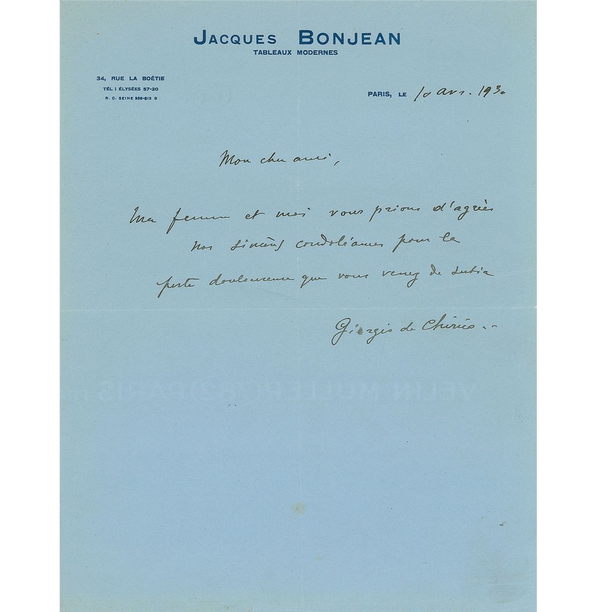 Uncommon ALS in French, one page, 8.25 x 10.5, Jacques Bonjean letterhead, April 10, 1930. Letter to a friend. In full (translated): “Please accept the sincere condolences of my wife and me for the painful loss that you just had.” In fine condition, with central vertical and horizontal folds and a couple trivial spots of soiling.
