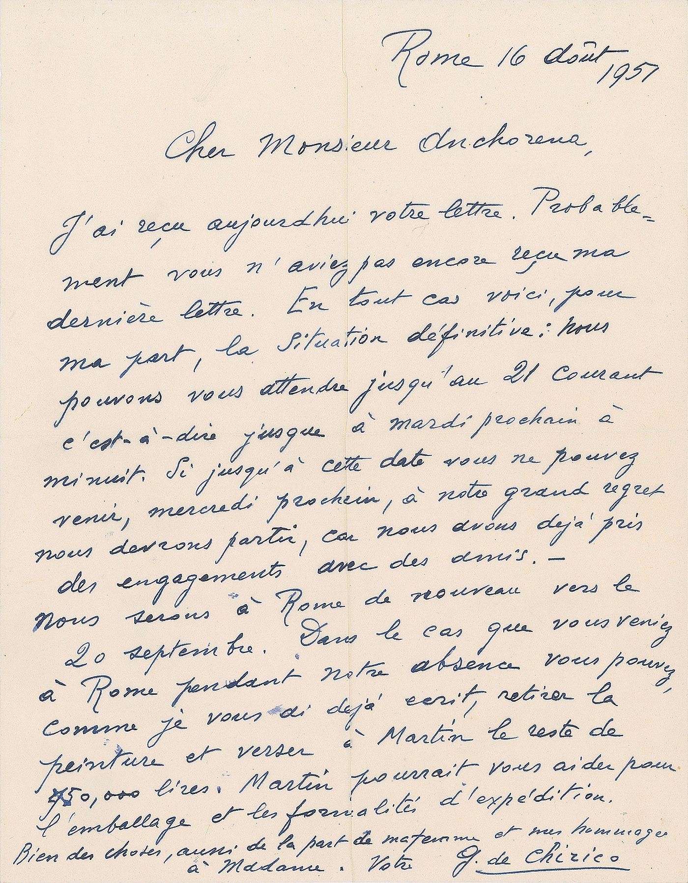 Italian artist and writer (1888–1978) who founded the scuola metafisica art movement, which profoundly influenced the surrealists. Untranslated ALS in French, signed “G. de Chirico,” one page, 8.5 x 11, August 16, 1951. In fine condition.
