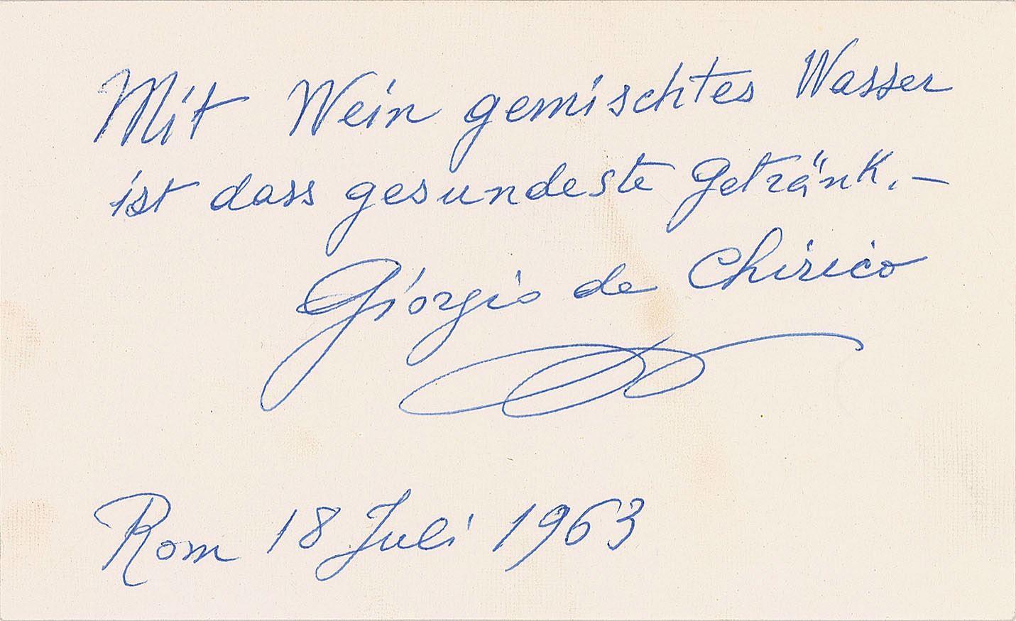 Italian artist and writer (1888–1978) who founded the scuola metafisica art movement, which profoundly influenced the surrealists. Interesting AQS in German on a white 5.5 x 3.5 card, in full (translated): "Water mixed with wine is the healthiest drink. Giorgio de Chirico, Rome, 18 July 1963." In fine condition. Accompanied by the original mailing envelope, bearing an additional de Chirico signature in the return address on the flap.