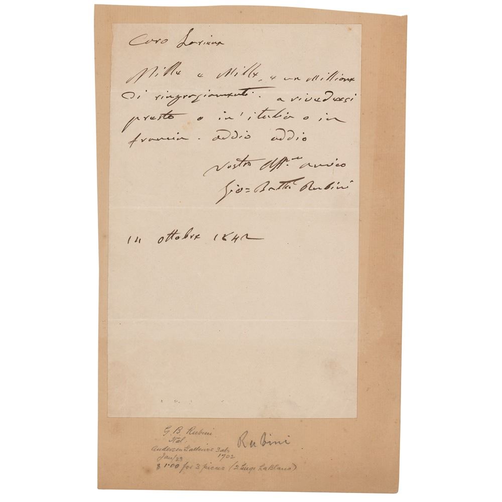 Famed early Italian tenor (1794-1854) remembered as an extraordinary bel canto singer, who popularized the use of a pervasive vibrato to heighten the emotional impact of his operatic performances. ALS in Italian, signed "Gio-Battista Rubini," one page, 5 x 8, October 14, 1842. Untranslated handwritten letter by the celebrated tenor. Affixed by its edge to a slightly larger sheet and in fine condition.