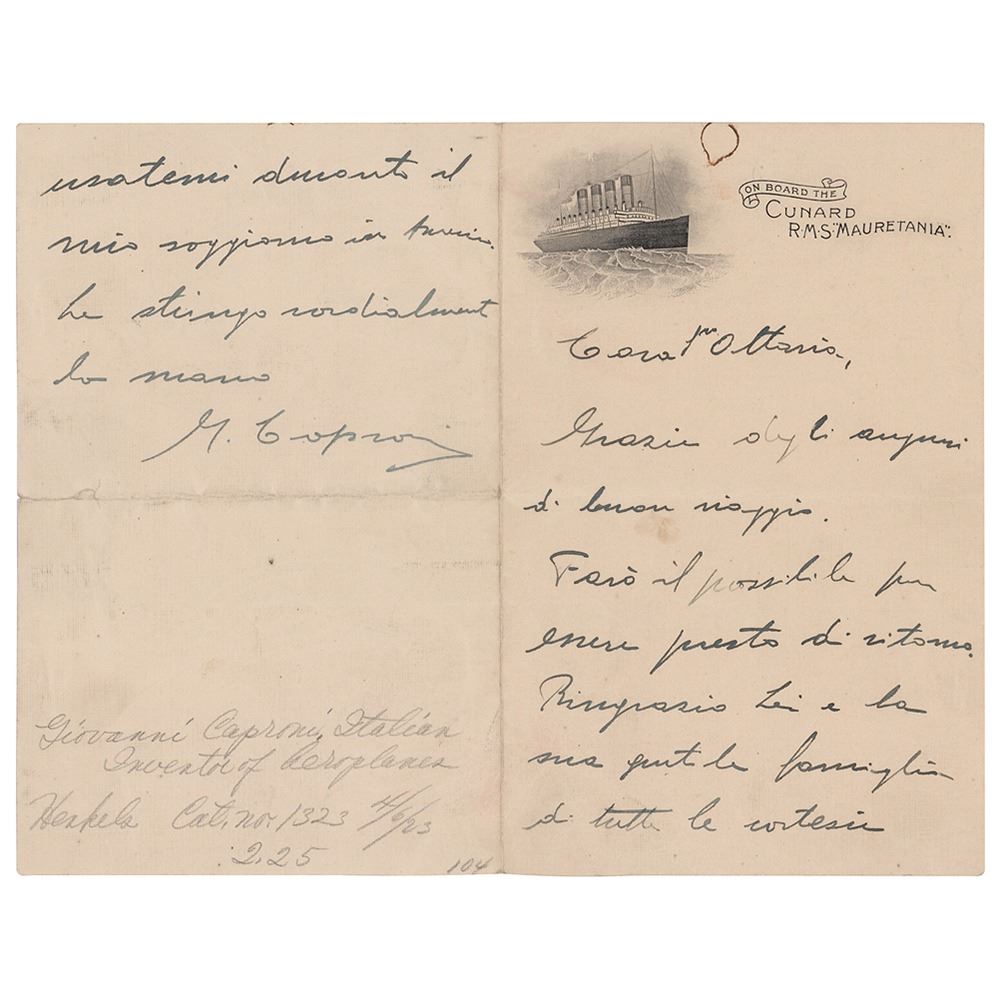 ALS in Italian, signed “G. Caproni,†two pages on two adjoining sheets, 4.5 x 7, RMS Mauretania letterhead, no date. Untranslated handwritten letter written on board the famous ocean liner. In fine condition, with an old repair to a fold split on the second page, and a small rusty paperclip impression to the top edge of the first page.