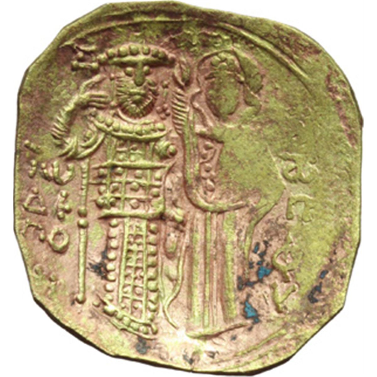 Impero Bizantino. Giovanni III di Nicea (1222-1254). AU hyperpyron, Magnesia. D/ Cristo benedicente, seduto in trono di fronte, tiene il libro dei Vangeli. R/ Giovanni e la Vergine stanti di fronte, quest'ultima nell'atto di incoronare l'imperatore. Sear 2073. D.O. IV,XXIX,4. AU. g. 2.88 mm. 25.00 qSPL.