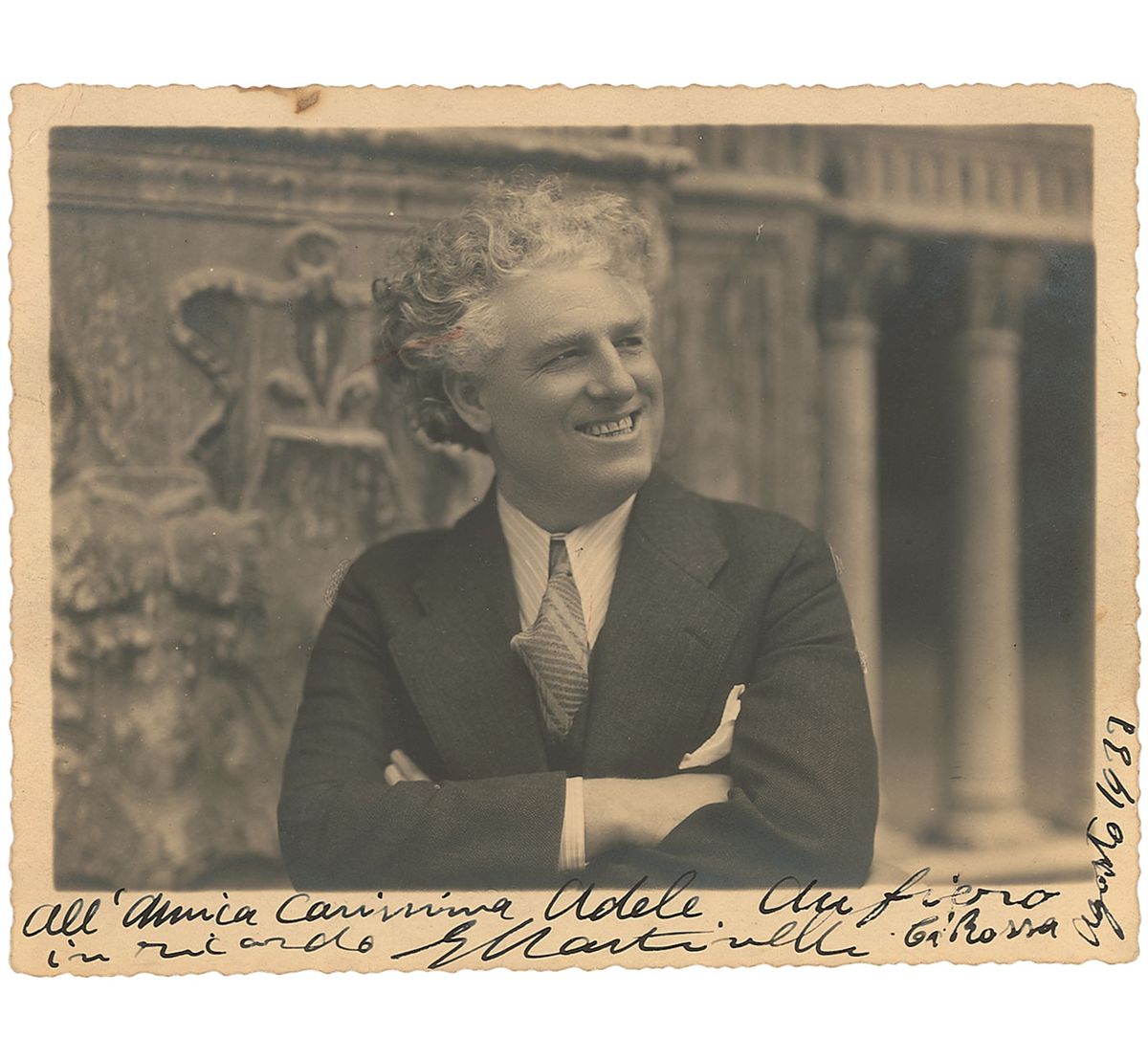 Italian operatic tenor associated with the lyric-dramatic repertory (1885–1969). Matte-finish 5.75 x 4.5 photo of Martinelli with his arms crossed, signed and inscribed in fountain pen in French, and dated August 1933. In fine condition, with a small stain to the top edge and an unobtrusive mark to the back of his head.