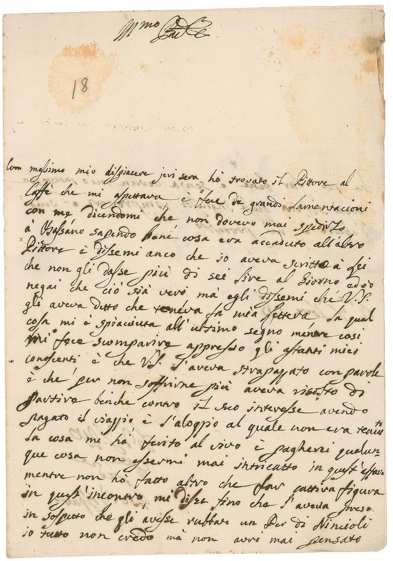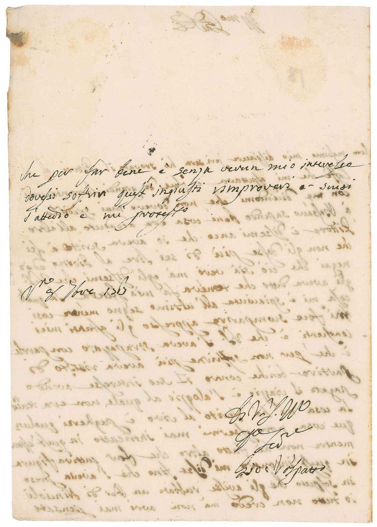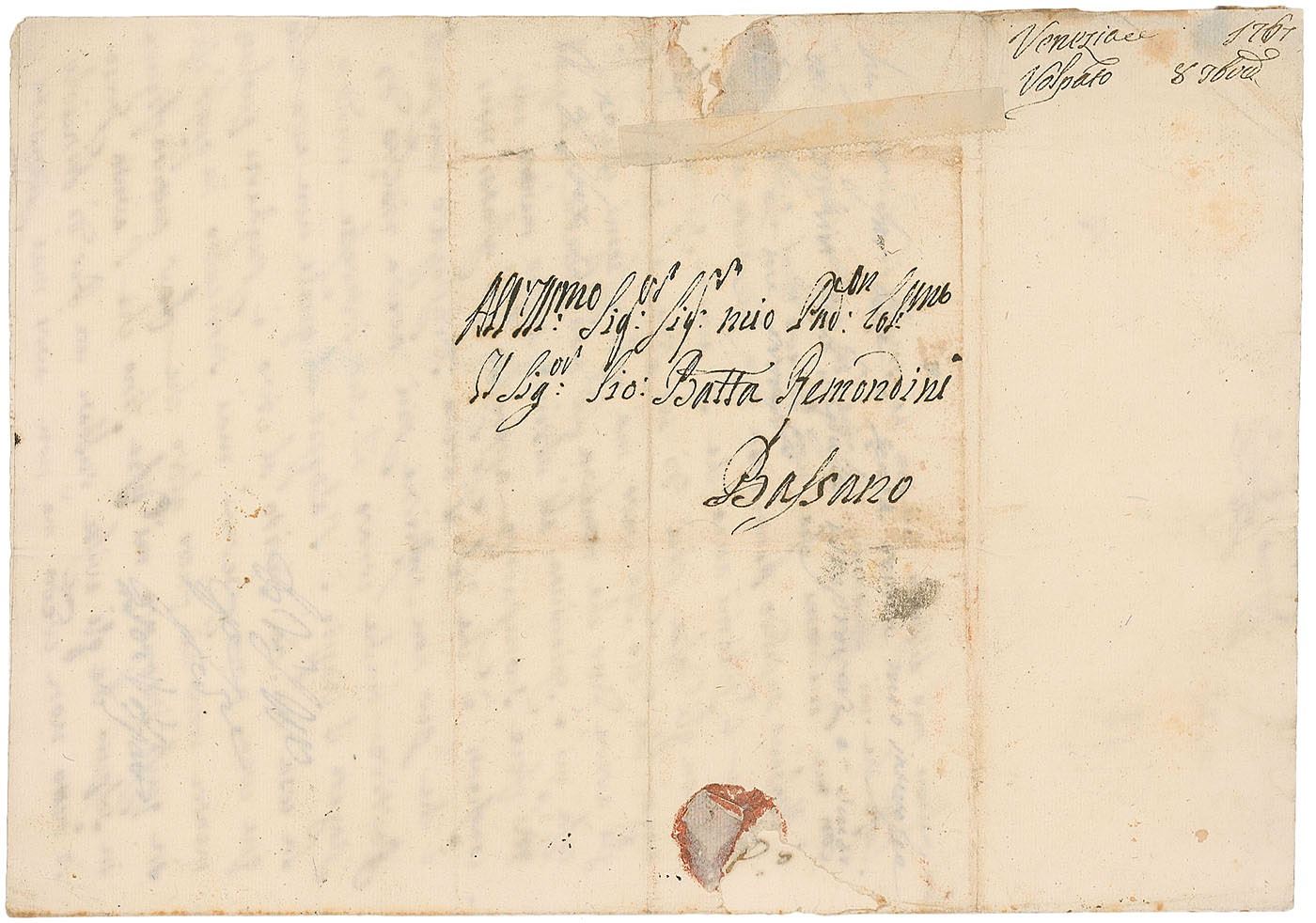 Italian engraver, excavator, dealer in antiquities, and manufacturer of biscuit porcelain figurines (1735–1803). ALS in Italian, signed “Gio. Volpato,” one page both sides, 7.75 x 11, September 7, 1767. Untranslated letter to Giambattista Remondini at Bassano. Addressed on the integral address leaf in Volpato's hand. In fine condition, with scattered light staining, and seal-related paper loss to the integral address leaf.