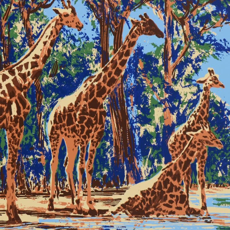 "Giraffe Lake" is a limited edition serigraph on deckle-edge paper from an AP edition and hand signed by Paul Blaine Henrie (1932-1999). Includes Certificate of Authenticity. Measures approx. 26" x 20" (border), 24.5" x 17.5" (image). ** Please note: due to the age of the piece there is some minor yellowing of the paper in the white border area. **