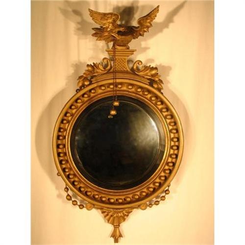 Classical gilt-wood and gesso, ebonized convex wall mirror having spread winged eagle finial above flaring plinth. All above circular coved ball-mounted frame with black fillet, all above pendant drop. Upon close inspection, there appears to have been some minor restoration (although barely visible to the naked eye) to the carved scroll on top right, the plinth as well as the surface gilt work. The back side is covered in old surface paper which I was hesitant to remove for a complete inspection. There does exists remnants of older glue to the top bracket. The glass and rear facing aspects of the piece appear to be original. There is a decidely militant appearance to the eagle which is unlike many of the predominantly English renditions of Girandole mirrors. A wonderful wingspan and commanding presence for this circa 1815 mirror. Generally speaking, this mirror is in a good state of preservation. Accomodations to price have been made for noted restoration. Overall Height ? 38"