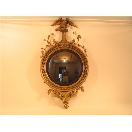Classical gilt-wood & gesso and ebonized convex wall mirror having spread winged eagle finial above flaring plinth surrounded by carved oak leaf foliate. All above circular frame with black fillet, all above a wonderfully carved drop. As with most girandole mirrors of the period, this is likely an English mirror. The oak leaf foliate is rare and desirable. The height of the plinth is exceptional which adds to the lasting aesthetic value of the piece. There are two slots on the rear of the mirror indicating that it may have had candle arms at one point in its life. This mirror is in a wonderful state of preservation with original gilded surface. No restoration to the surface, looking glass or back. The mirror measures 38" high. The looking glass measures 14" in diameter. The frame measures 21.5 in diameter. For shipping purposes, this item is shipped in a custom built wooden case. It is shipped fully insured. Your complete satisfaction is our goal. If you are not happy with an item purchased, return it in it's original condition for a refund.