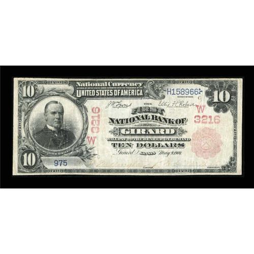<B>Girard, KS</B></I> - $10 1902 Red Seal Fr. 613 <B>The First NB Girard</B></I> Ch. # (W)3216<BR> Though a bit faded, the paper remains complete on the only known Red Seal from here. The signatures are also noticeable on this <B>Fine</B></I> example<B>.</B></I><BR><BR><b>Shipping:</b> Coins & Currency (<a target="_blank" href="http://www.heritageauctions.com/common/shipping.php">view shipping information</a>)