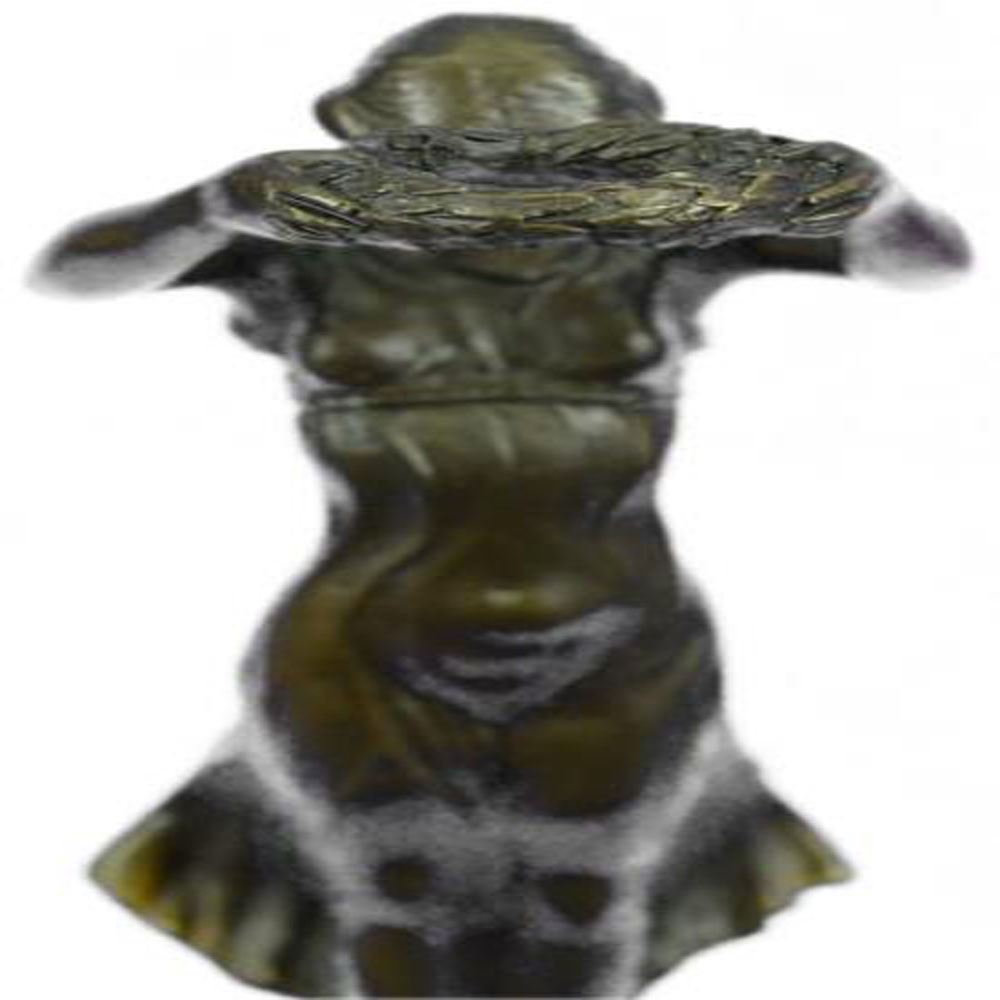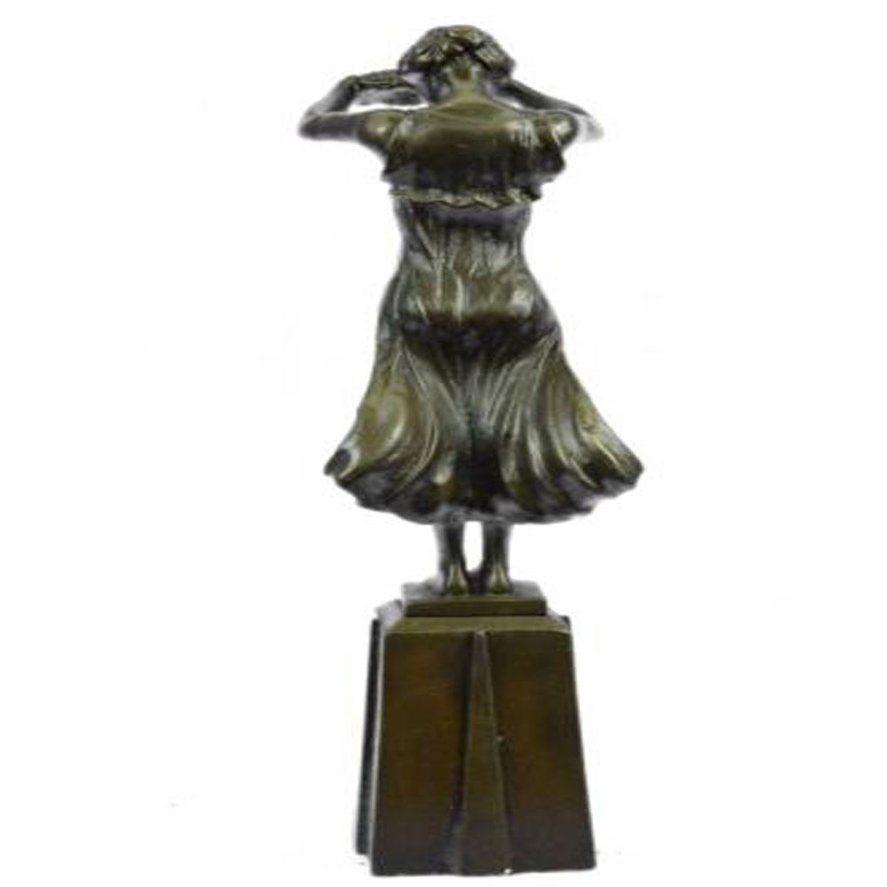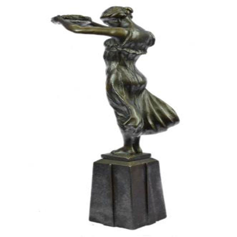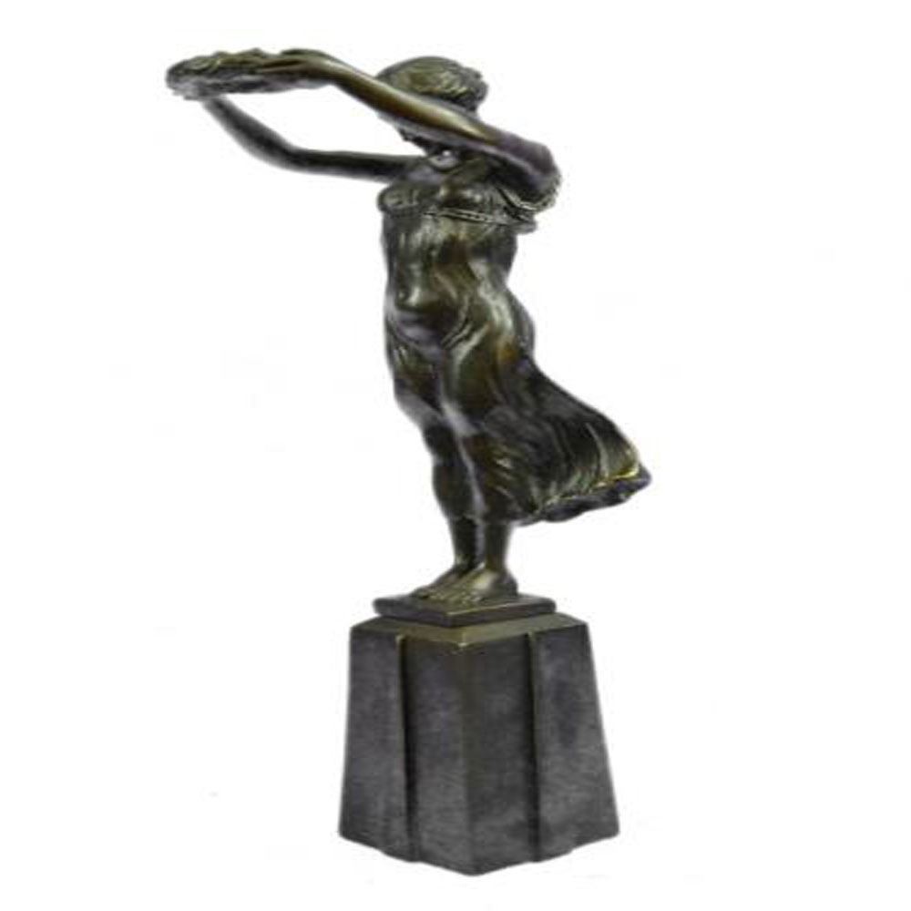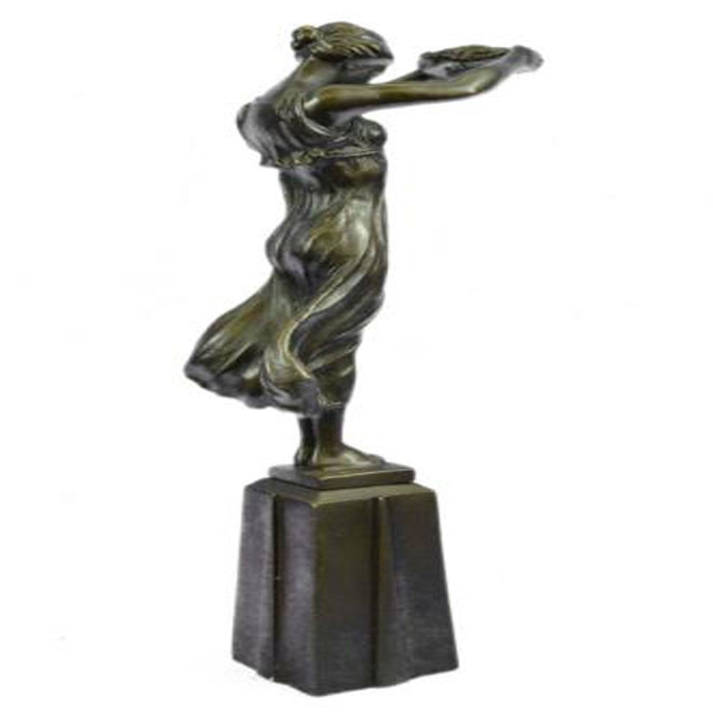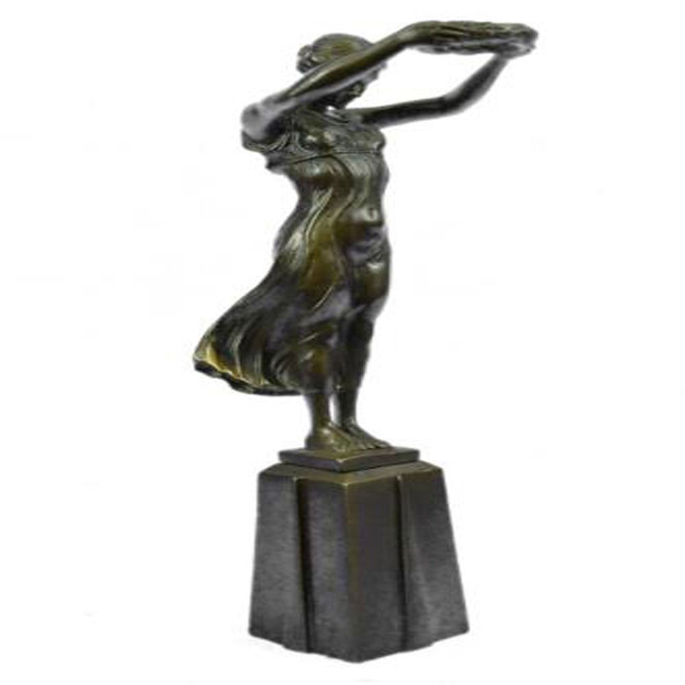 The Bronze maiden stands barefoot, her head in a humble bow, holding with raised arms, an honorary wreath to place on the crown of an idolized hero. She stands as the winds press her transparent dress against her body marking her form underneath. She was molded using the age-old method of lost wax casting and stained with brown patina tarnish. Dimensions: Height 12 X Width 3 inches. Weight: 5 LBS.
