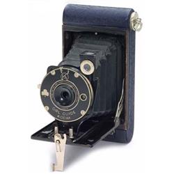 € 85,- Kodak Ltd., England, 4,5 x 6 cm auf 127er Rollfilm. Blaues Metallgehäuse, schwarzer Balgen, Logo blau. Original-Tasche. Blue colored, black bellows, blue Girl Guide logo. With original case. - (3-/3+) - € 150/250 - (62/40)