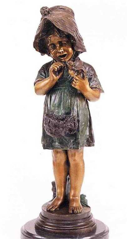 "Girl Holding Bird" Bronze Sculpture - After Fuenze - Beautiful Color Patina/Museum Brown Finish - Mounted On A Fine Italian Marble Base - Beautifully Detailed - Signed - Mint Condition - 24.5"H X 7"W - Lost Wax Cast Bronze