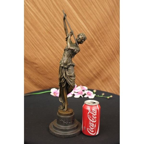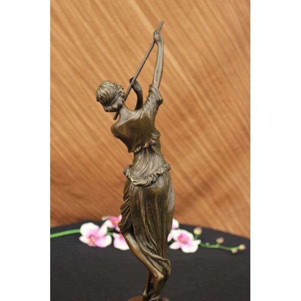 As she dances, she plays her flute ever so graciously as if it is the music from the heavens. She is a gorgeous and quaint girl, she wears a loosed flowing dress that bunches by her legs and flows with her every movement. She holds her petite hands up and blows through her flute creating magical sounds. She has a thick belt around her waist helping to break up the sculpture and give her dimension. This is a beautiful piece and is sure to add a touch of class to any room. This sculpture was cast using the lost wax method and has a gorgeous two tone brown patina and is mounted on a black marble base. Bronze dimensions with marble base: Height 19 X Width 6 inches. Weight: 10 lbs. Please Note: This is a reproduction bronze sculpture from the original molded and signed. This featured bronze sculpture is a recast after the original, and has been done recently. This 100% bronze sculpture is an abstract piece certain to be a conversation piece.Please Note: This is a reproduction bronze sculpture from the original molded and signed. This featured bronze sculpture is a recast after the original, and has been done recently. This 100% bronze sculpture is an abstract piece certain to be a conversation piece.