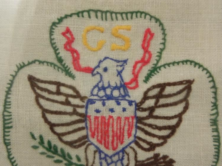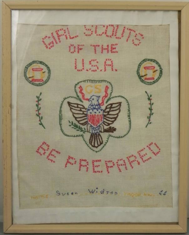 If you remember the learning needlepoint in Girl Scouts, then you'll love this vintage sign with their beloved emblem. It is all framed, with paper matting done by the scout (this could be removed too). The wood frame is 11 3/4 x 14 3/4 inches. It is in very good condition. This is a charming needlepoint from scouting days past.