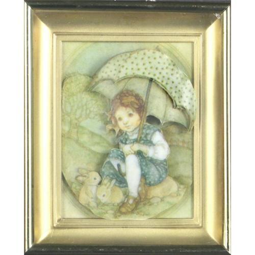 This is a very whimsical shadow box that is in very good condition. This three dimensional style of art is very attractive and eye-catching. The compositional layout of this shadow box is both creative and well planned. Its design convinces the viewer of its reality and gives a sense of tangibility. This picture is excellently framed in a gold metal frame that enhances the warm colors in the picture and measures, 5.5?? x 4.5?. This is a very unique picture at a great price.