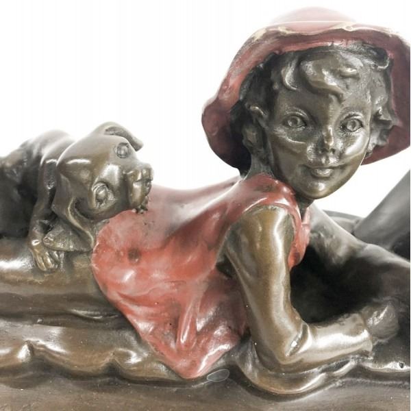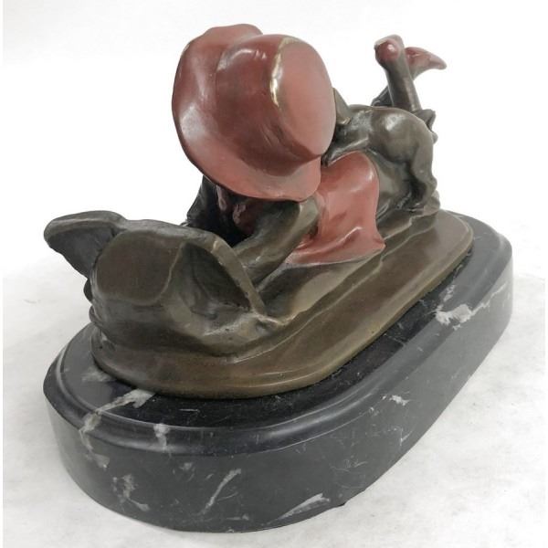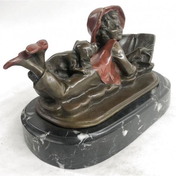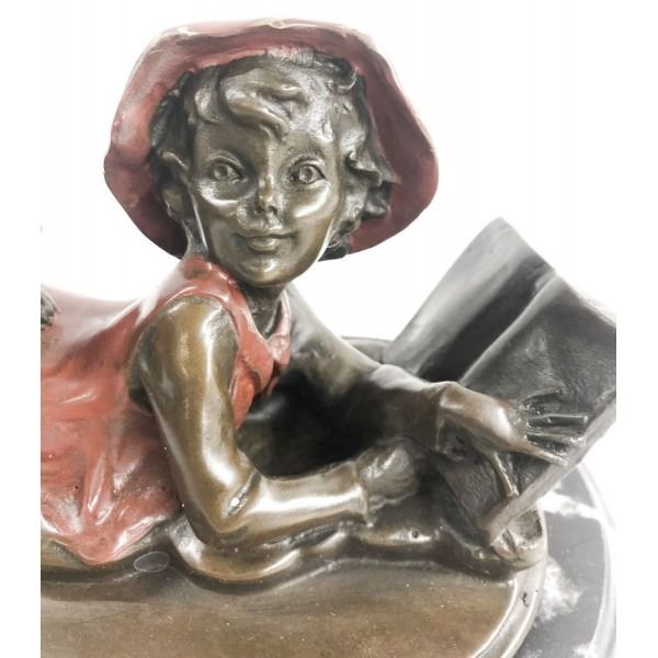 This lost-wax cast bronze sculpture is of a boy who was pleasantly startled by the viewer due to his concentration in his open book. He lies belly down in perhaps a field, under a tree, on a beautiful day reading with his pup on his back, urging him to come to play already! The sculpture entirety beautifully captures the carefree innocence of a young boy who is in no rush to grow up and fill his oversized hat. The youth, atop a marble base. Dimensions: Height 6 X Width 8 inches. Weight: 7 LBS.