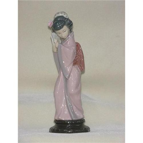 11 3/4'' tall of an Oriental female figure dressed in a kimono and traditional hairstyle coyly hiding her face with a fan. Signed ''Lladro'' marked ''28S''. Condition is excellent.