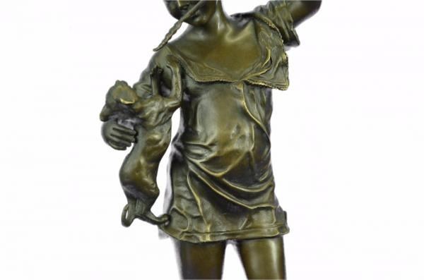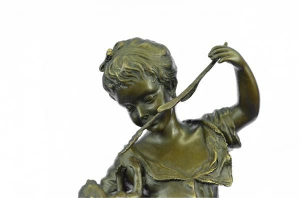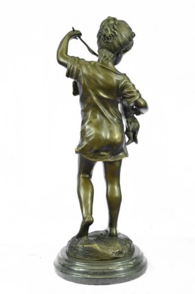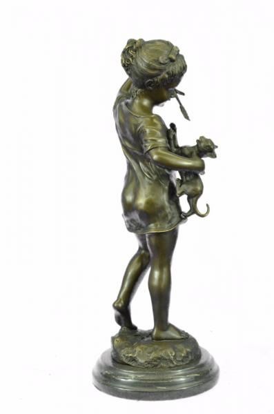 A young girl enjoys an innocent afternoon playing with her cat. Dressed simply in a short sleep shirt, that is opened slightly acrossher flat chest and barefoot. Her messy hair is pulled up into a shortponytail and a bow tied across the front of her hair. Bangs frame herchubby face and loose strands cover the nape of her neck. She gazesdown lovingly at the cat that jumps at her hip, trying to get its pawson the wheat branch stem she holds over its head teasingly. The cat paws curl in hopes of clutching it and its mouth opens for a meow. Sheis a brown patina with subtle gold touches for detail. This Sculpture was cast using the Lost Wax Method and is mounted on a black marble base. Bronze Dimensions with Marble Base: Height 16 X Width 6 inches. Weight: 12 LBS.