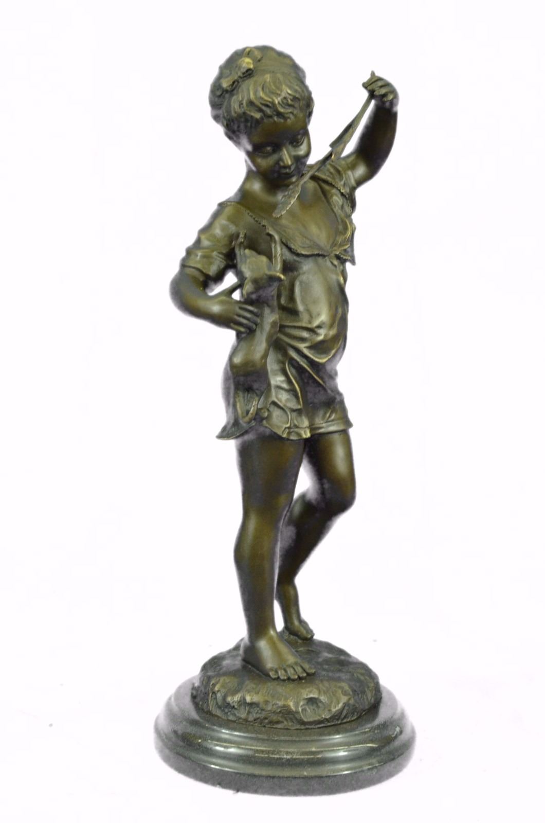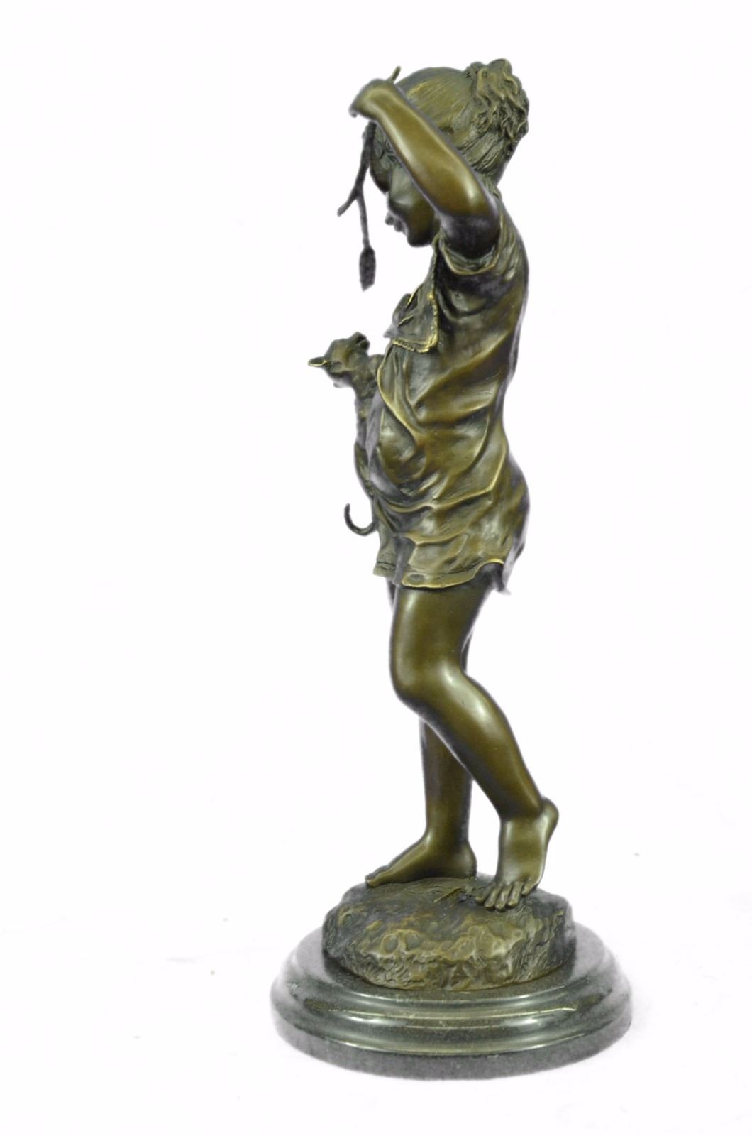 A young girl enjoys an innocent afternoon playing with her cat. Dressed simply in a short sleep shirt, that is opened slightly across her flat chest and barefoot. Her messy hair is pulled up into a short ponytail and a bow tied across the front of her hair. Bangs frame her chubby face and loose strands cover the nape of her neck. She gazes down lovingly at the cat that jumps at her hip, trying to get its paws on the wheat branch stem she holds over its head teasingly. The cats paws curl in hopes of clutching it and its mouth opens for a meow. She is a brown patina with subtle gold touches for detail. This sculpture was cast using the lost wax method and is mounted on a round black marble base. Bronze dimensions with marble base: Height 16 X Width 6 inches. Weight: 12 lbs.Please Note: This is a reproduction bronze sculpture from the original molded and signed. This featured bronze sculpture is a recast after the original, and has been done recently. This 100% bronze sculpture is an abstract piece certain to be a conversation piece.Please Note: This is a reproduction bronze sculpture from the original molded and signed. This featured bronze sculpture is a recast after the original, and has been done recently. This 100% bronze sculpture is an abstract piece certain to be a conversation piece.