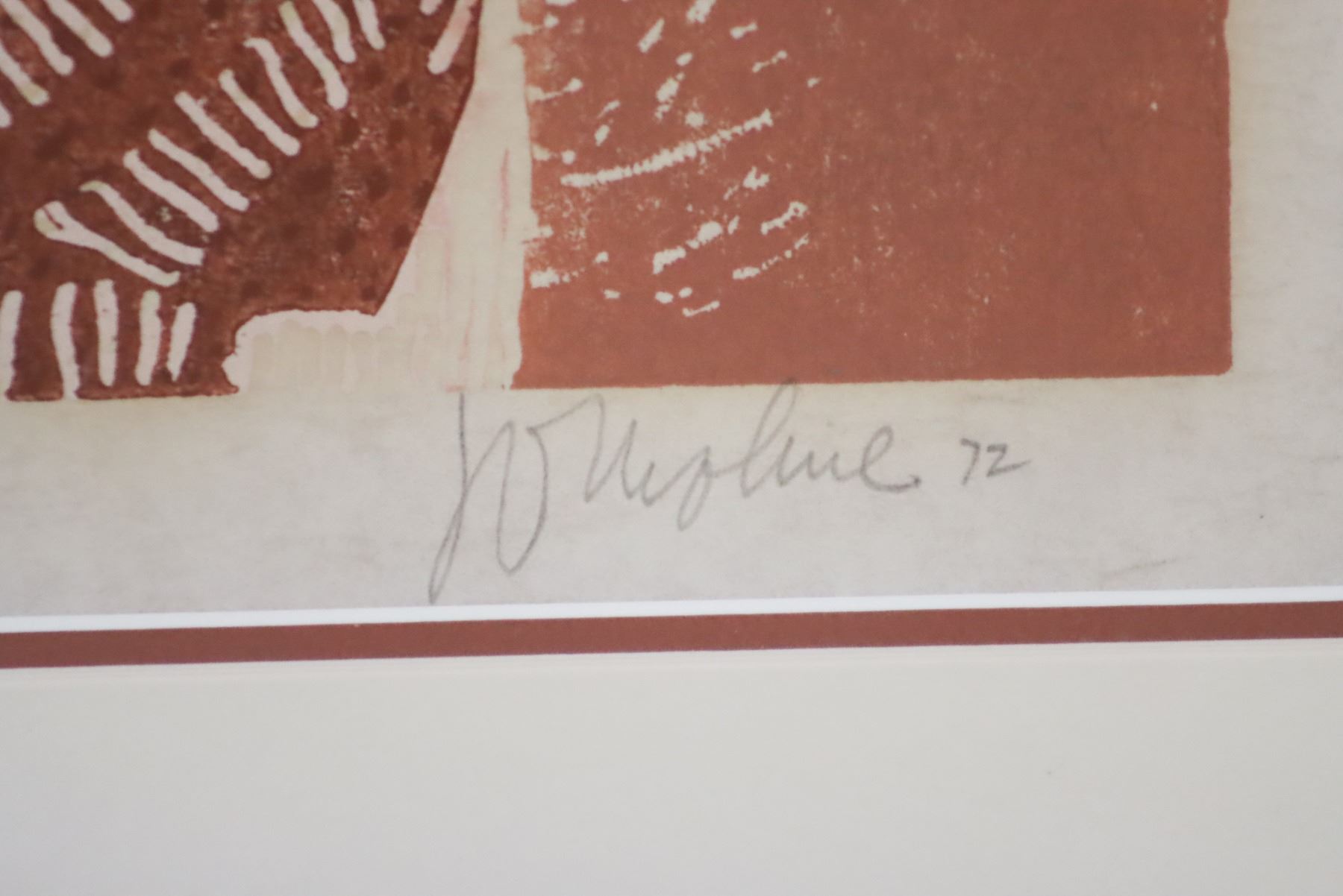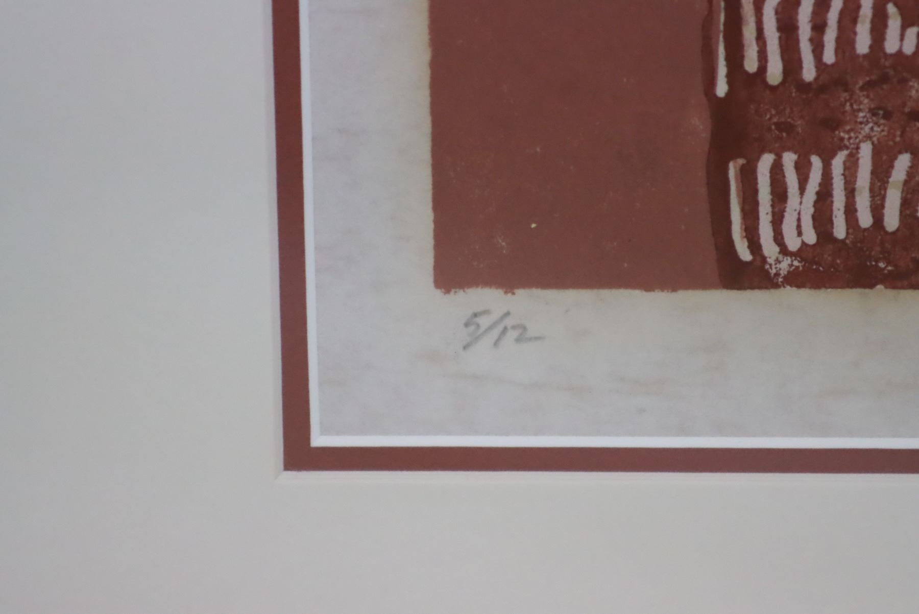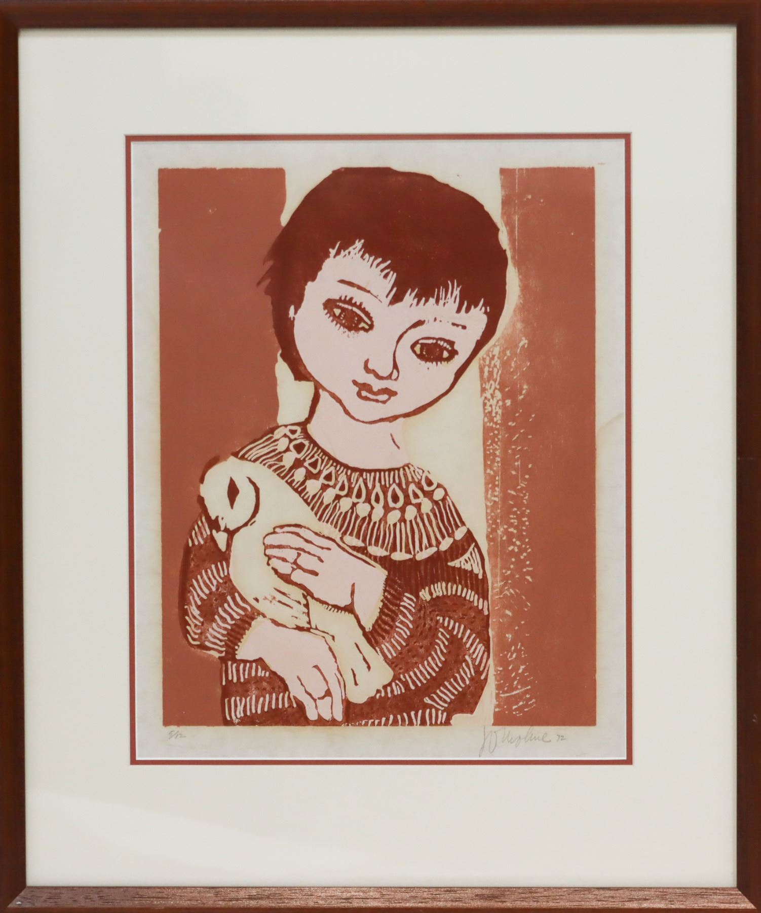 Framed woodblock print of a young girl wearing a patterned sweater, holding a gentle dove. Signed indistinctly in pencil and numbered 5/12.