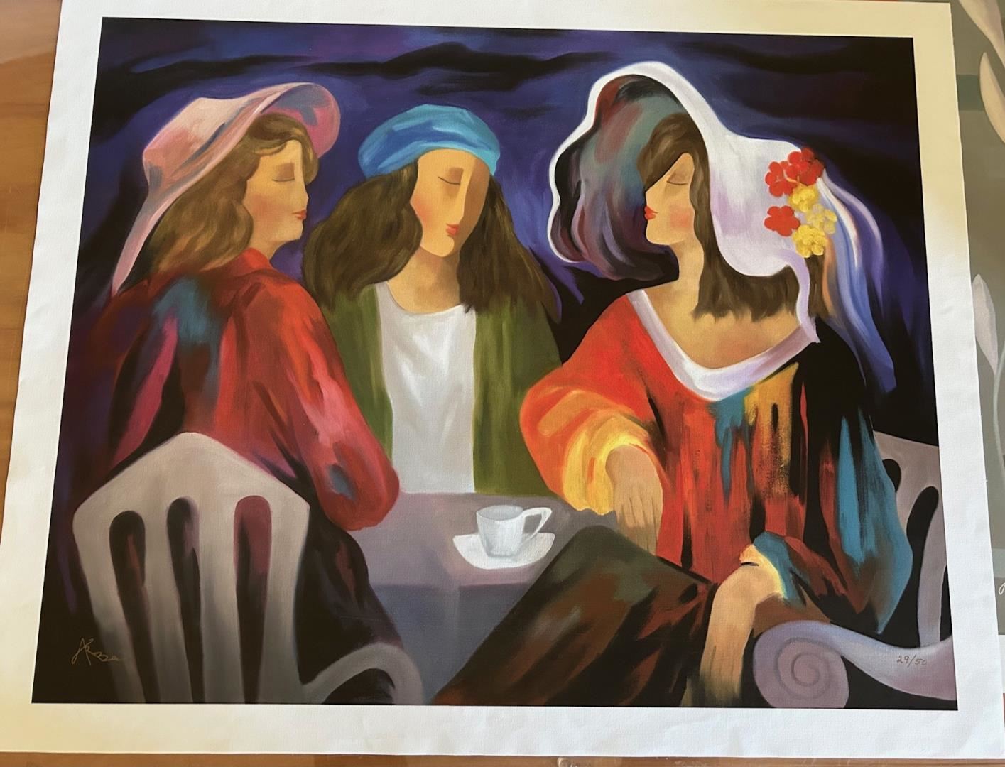 A beautifully drawn and colored image of three women in a café by renowned artist ARBE. Measuring 23.75x29.75 this is a rare & unique image outside the artist's typical style.