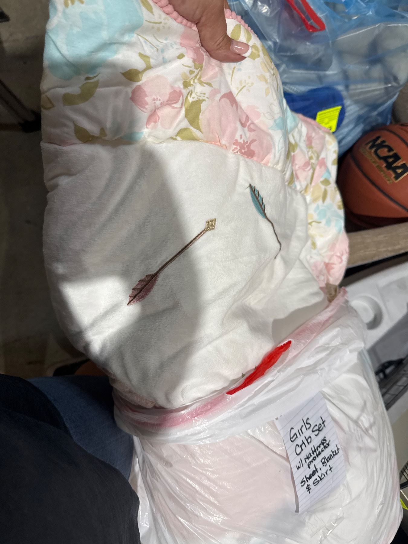 Girls crib, set with mattress, protector, sheet blanket, and skirt