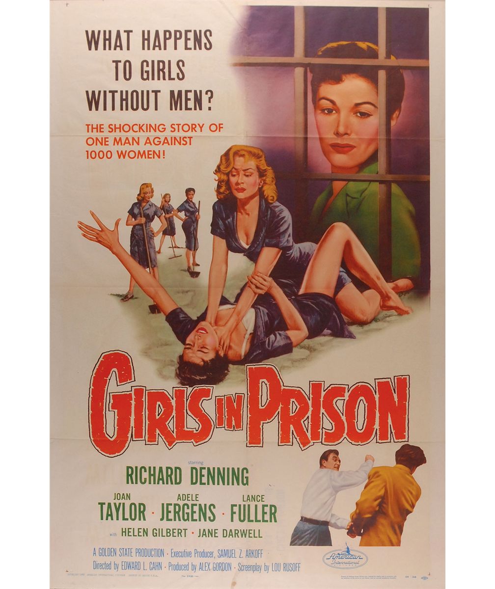 Original color 27 x 41 one sheet movie poster for the 1956 film Girls in Prison, starring Richard Denning, Joan Taylor, and Jane Darwell. In fine condition, with intersecting storage folds, and some scattered light toning and soiling. This particular poster has become quite collectible with its dominating image in the center of the poster of Helen Gilbert and Joan Taylor engaged in a catfight.