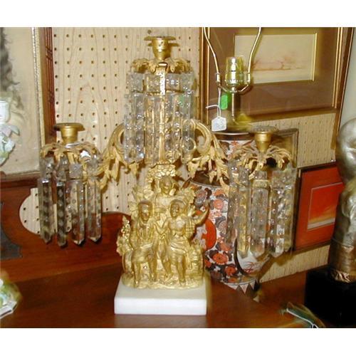 Large girondelle candlestick with lovely etched hanging crystals with 3 Indian figures on metal and marble base. It has an art nouveau design on metal. There is one crystal missing on the back of each of the candleholders. Buyer pays shipping and handling costs.