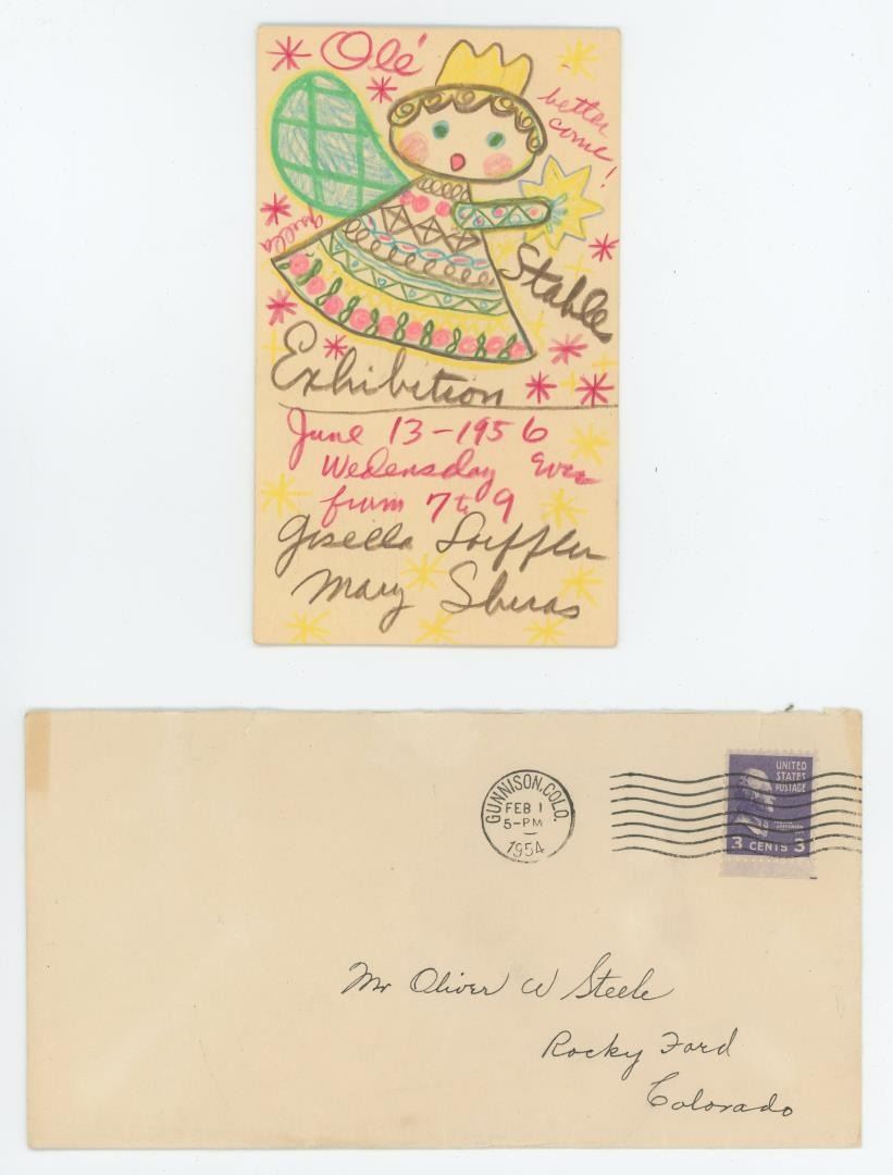 Title is Taos Postcard. 3 1/4" by 5 1/2" unframed. Colored Pencil. Provenance: Oliver W. Steele Collection; by descent to the present owners, Colorado. Gisella Loeffler (c. 1902 - 1977) was active/lived in New Mexico / Austria. Gisella Loeffler is known for Naive, folk-art style painting, crafts, Christmas card design. Born in Austria, Gisella Loeffler was noted as a Taos, New Mexico artist of decorative child folklore figures and illustration talents. Her cheerful Austrian and Mexican motifs were popular among her peers including Mabel Dodge Luhan. Loeffler signed her work simply "Gisella." From the Austrian Alps, she came with her family to the U. S. in 1908 and settled in St. Louis, Missouri where she, age five, was very disappointed in the drab appearance of her surroundings compared to where she had come from. Instead of flowers in her front yard, she found paved bricks. She studied art at Washington University, created posters for the St. Louis Post Dispatch and began working in batik on textiles. In the early 1920s, she married writer and music critic Edgar Lacher. An exhibition of Taos painter, Ernest Blumenschein, also from St. Louis, aroused her interest, and in 1933 she, divorced and moved with her two daughters to Taos where she lived the remainder of her life and found the happiness that had eluded her with her first husband. She married Frank Chase, a New Englander, and traveled extensively in Mexico and South America, and did paintings and illustrations of Navajo and Pueblo children in children's stories, and also did numerous murals for childrens' hospitals across the United States.