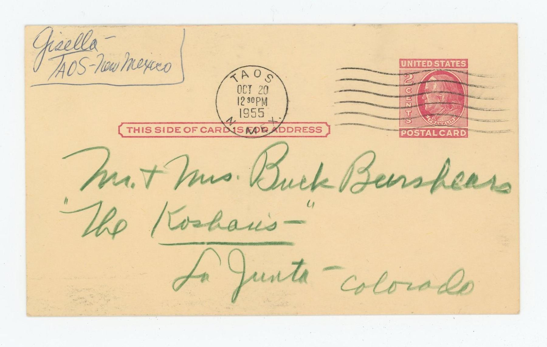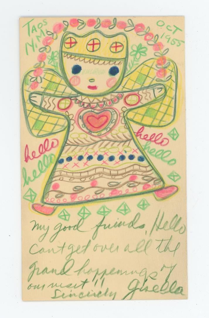 Title is Taos Postcard. 3 1/4" by 5 1/2" unframed. Colored Pencil. Provenance: Oliver W. Steele Collection; by descent to the present owners, Colorado. Gisella Loeffler (c. 1902 - 1977) was active/lived in New Mexico / Austria. Gisella Loeffler is known for Naive, folk-art style painting, crafts, Christmas card design. Born in Austria, Gisella Loeffler was noted as a Taos, New Mexico artist of decorative child folklore figures and illustration talents. Her cheerful Austrian and Mexican motifs were popular among her peers including Mabel Dodge Luhan. Loeffler signed her work simply "Gisella." From the Austrian Alps, she came with her family to the U. S. in 1908 and settled in St. Louis, Missouri where she, age five, was very disappointed in the drab appearance of her surroundings compared to where she had come from. Instead of flowers in her front yard, she found paved bricks. She studied art at Washington University, created posters for the St. Louis Post Dispatch and began working in batik on textiles. In the early 1920s, she married writer and music critic Edgar Lacher. An exhibition of Taos painter, Ernest Blumenschein, also from St. Louis, aroused her interest, and in 1933 she, divorced and moved with her two daughters to Taos where she lived the remainder of her life and found the happiness that had eluded her with her first husband. She married Frank Chase, a New Englander, and traveled extensively in Mexico and South America, and did paintings and illustrations of Navajo and Pueblo children in children's stories, and also did numerous murals for childrens' hospitals across the United States.
