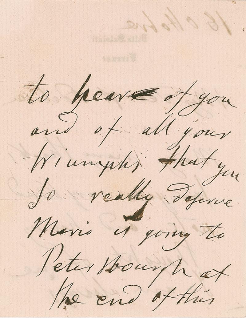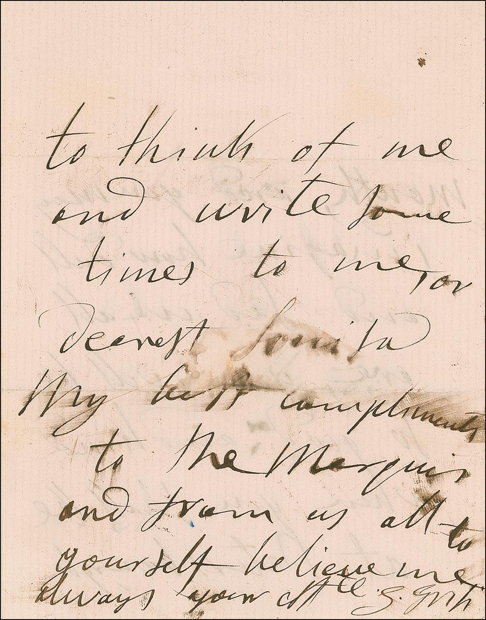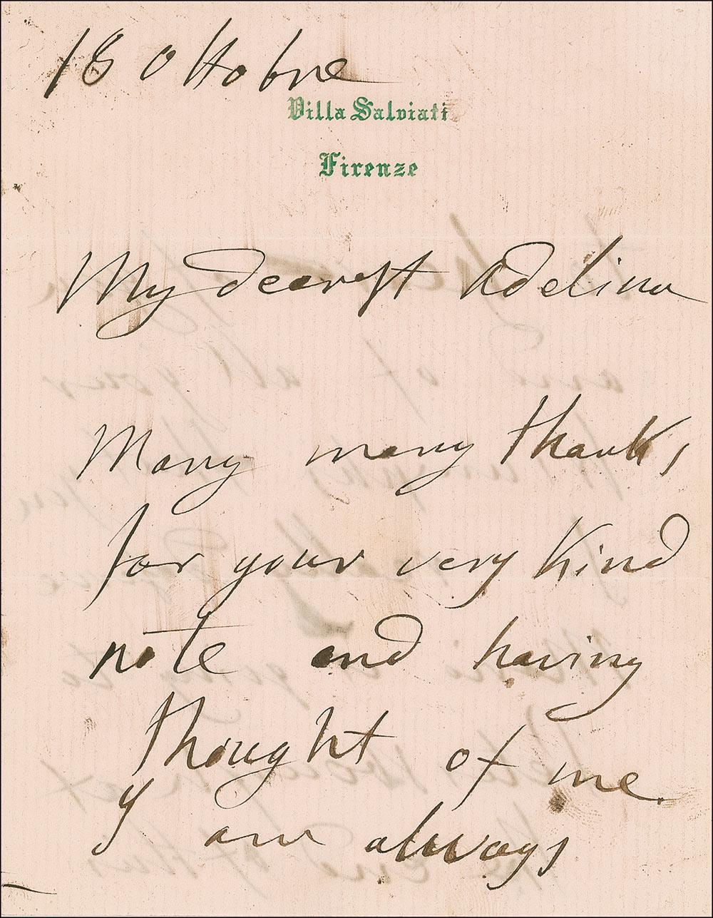 Italian opera singer, she was the daughter of one of Napoleon Bonaparte's Italian officers. ALS signed “G. Grisi,” four pages on two adjoining sheets, 4 x 5, Villa Salviati letterhead, no date. Letter to opera diva Adelina Patti. In part: “Many many thanks for your very kind note and having thought of me. I am always to hear of you and of all your triumphs that you really deserve…My best compliments to the Marquis.” In very good condition, with several brushes to text, light show-through from text on reverse, and a bit of light soiling.