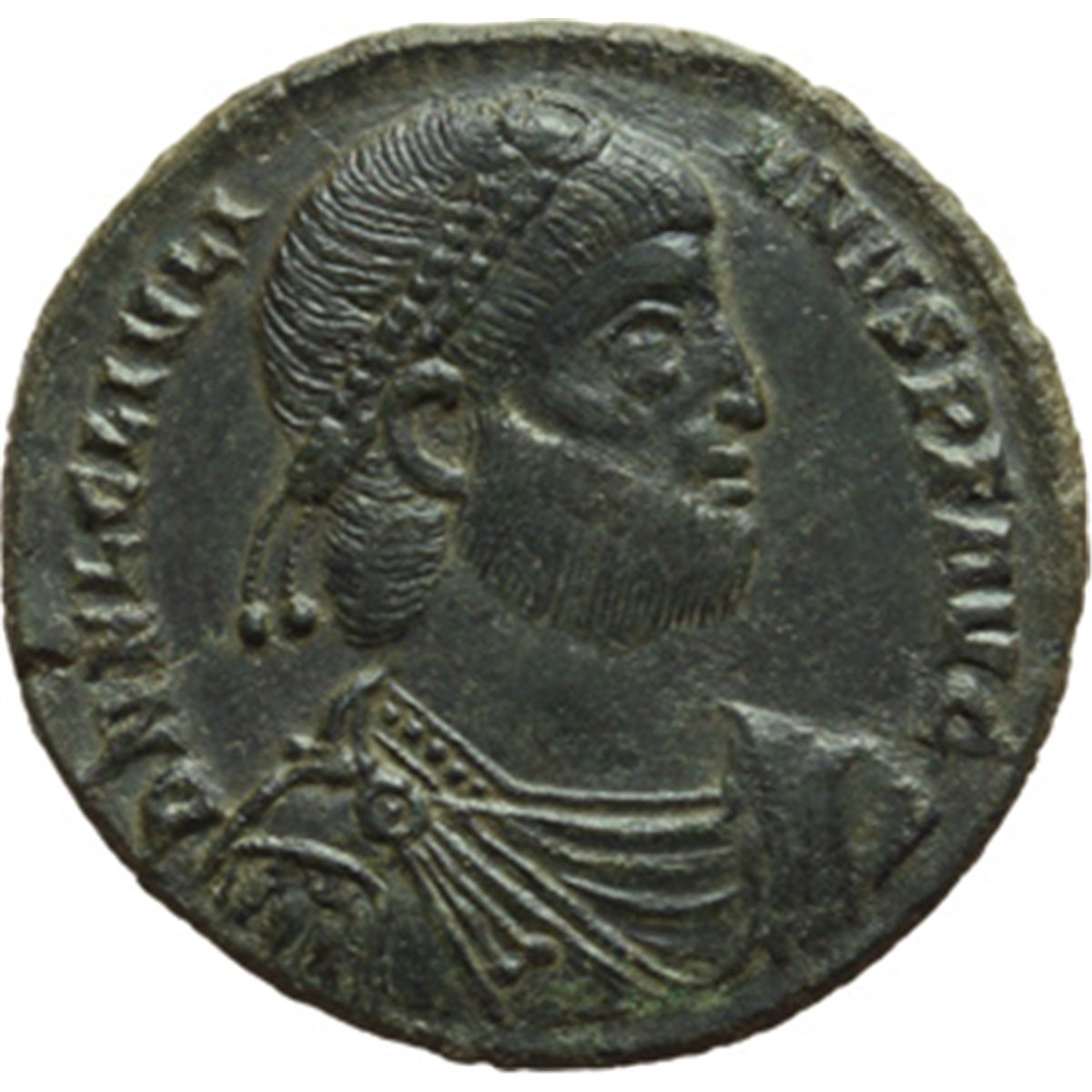Impero Romano. Giuliano II l' Apostata (360-363). Doppia maiorina, Thessalonica. D/ DN NL (sic) CL IVLIANVS PF AVG. Busto diademato, drappeggiato e corazzato a destra. R/ SECVRITAS REIPVB. Il toro Api a destra. Sopra, due stelle. In esergo: ramo TESΓ punto. RIC 224. AE. g. 8.81 mm. 28.00 R. Bel BB+.