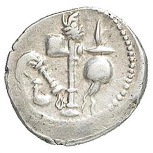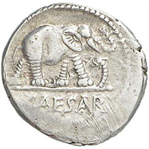 Repubblica Romana. Giulio Cesare. Denario, 49-48 a.C. D/ Elefante che cammina a destra calpesta un serpente. In esergo: CAESAR. R/ Simpulum, aspergillum, ascia e capis. Cr. 443/1. gr. 3.87 AG. qSPL/SPL.