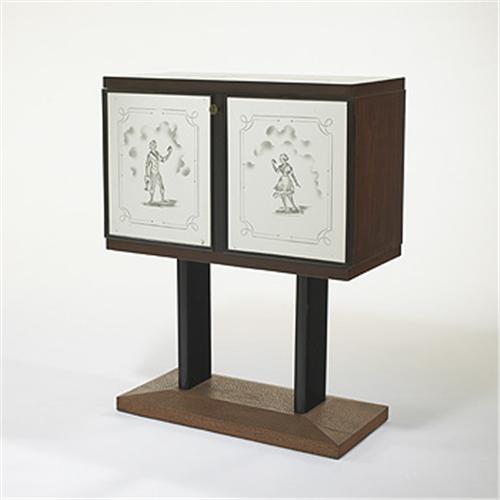 Two doors conceal mirrored interior with four small shelves for glasses and one large adjustable shelf.