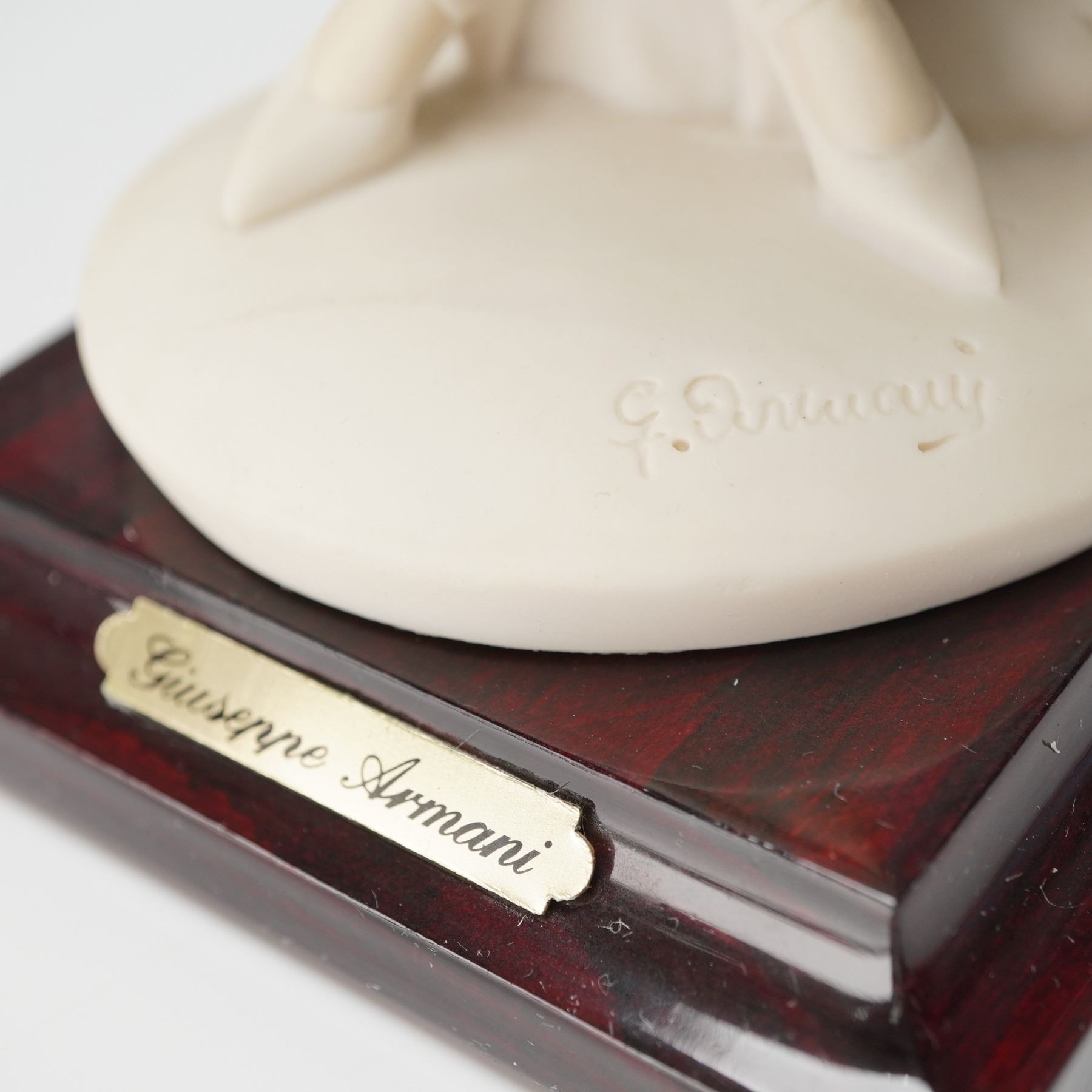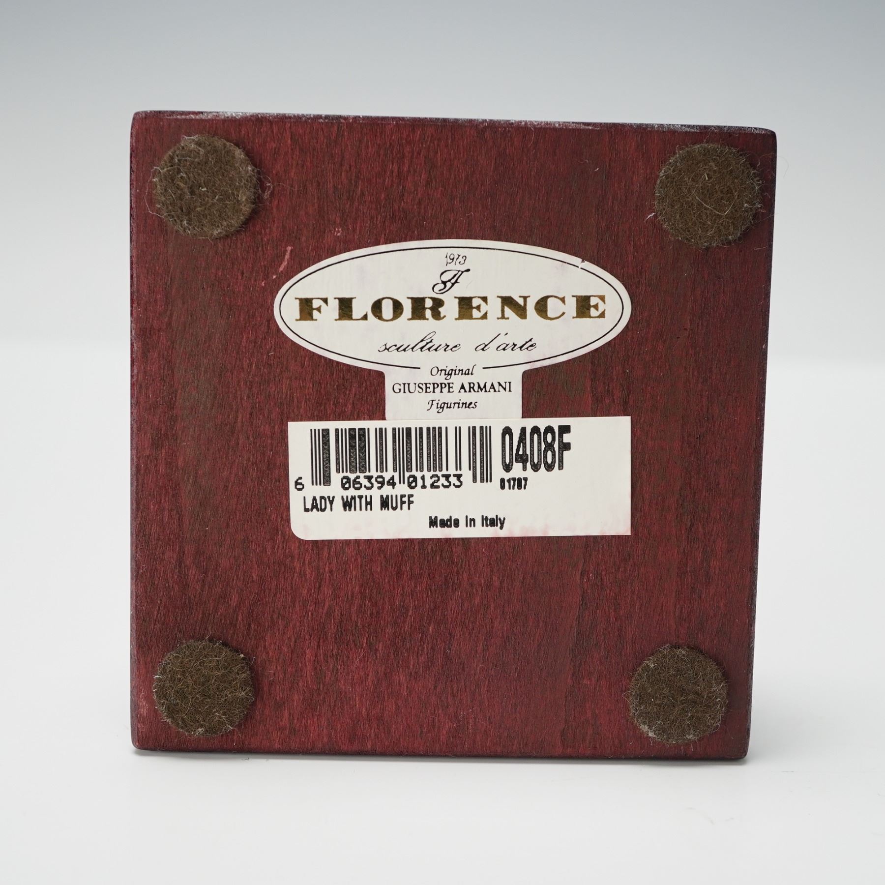 Porcelain figurine made in Italy in 1987. The elegant sculpture depicts a refined woman in a layered dress and hat, gently holding a fur muff. Mounted on a polished wooden base with a brass nameplate reading Giuseppe Armani. Underside marked 1987 Florence and retains original label. 0408F