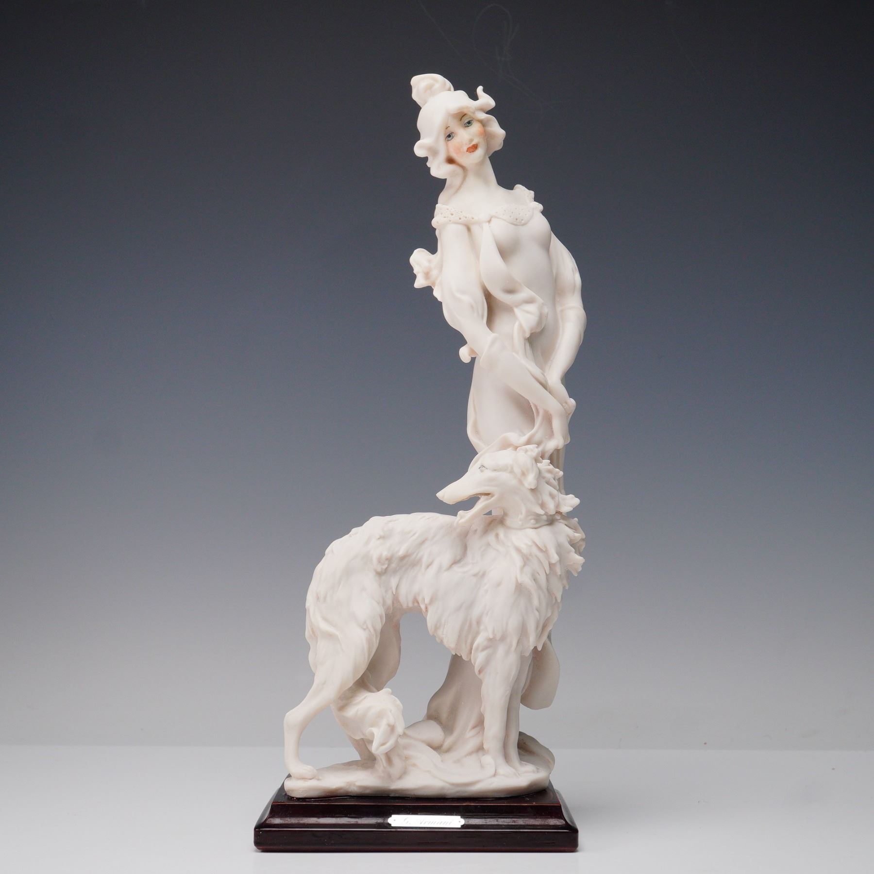 Giuseppe Armani (Italian, 1935-2006) figurine depicting an elegant woman in flowing gown with a Borzoi dog at her side. The sculpture reflects Armani's signature elongated forms and Art Deco-inspired styling, blending fashion and refinement with naturalistic detail in the animal's textured coat. Signed G. Armani on base with impressed Florence mark and copyright date 1987, mounted on a wood plinth with a metal nameplate. Produced by Florence Studios, Italy.