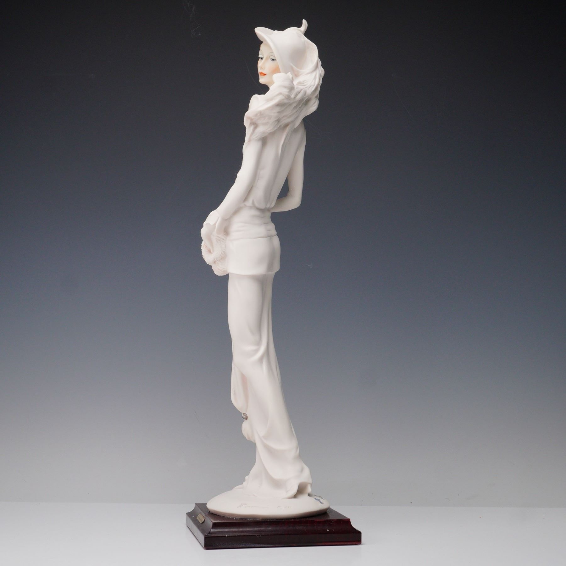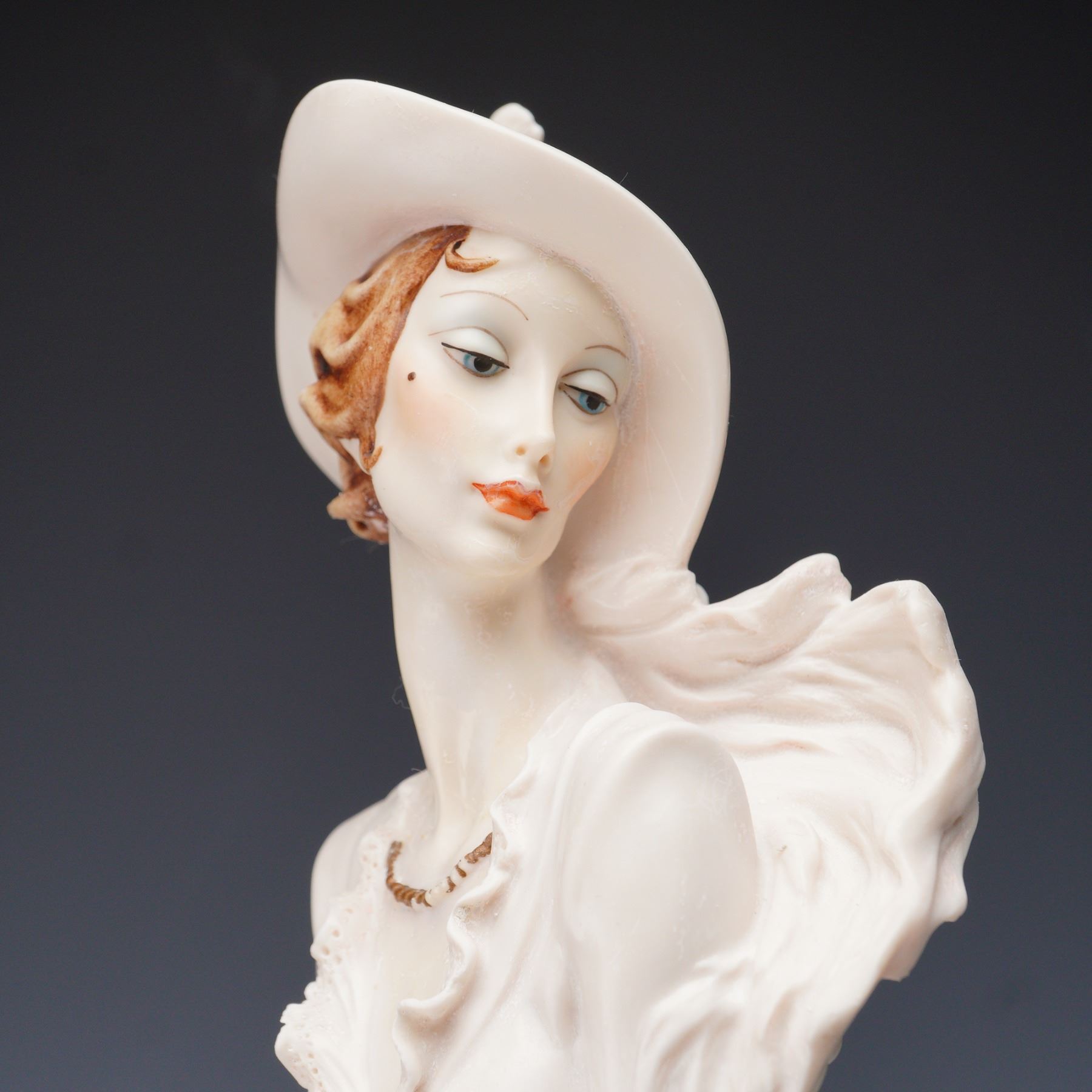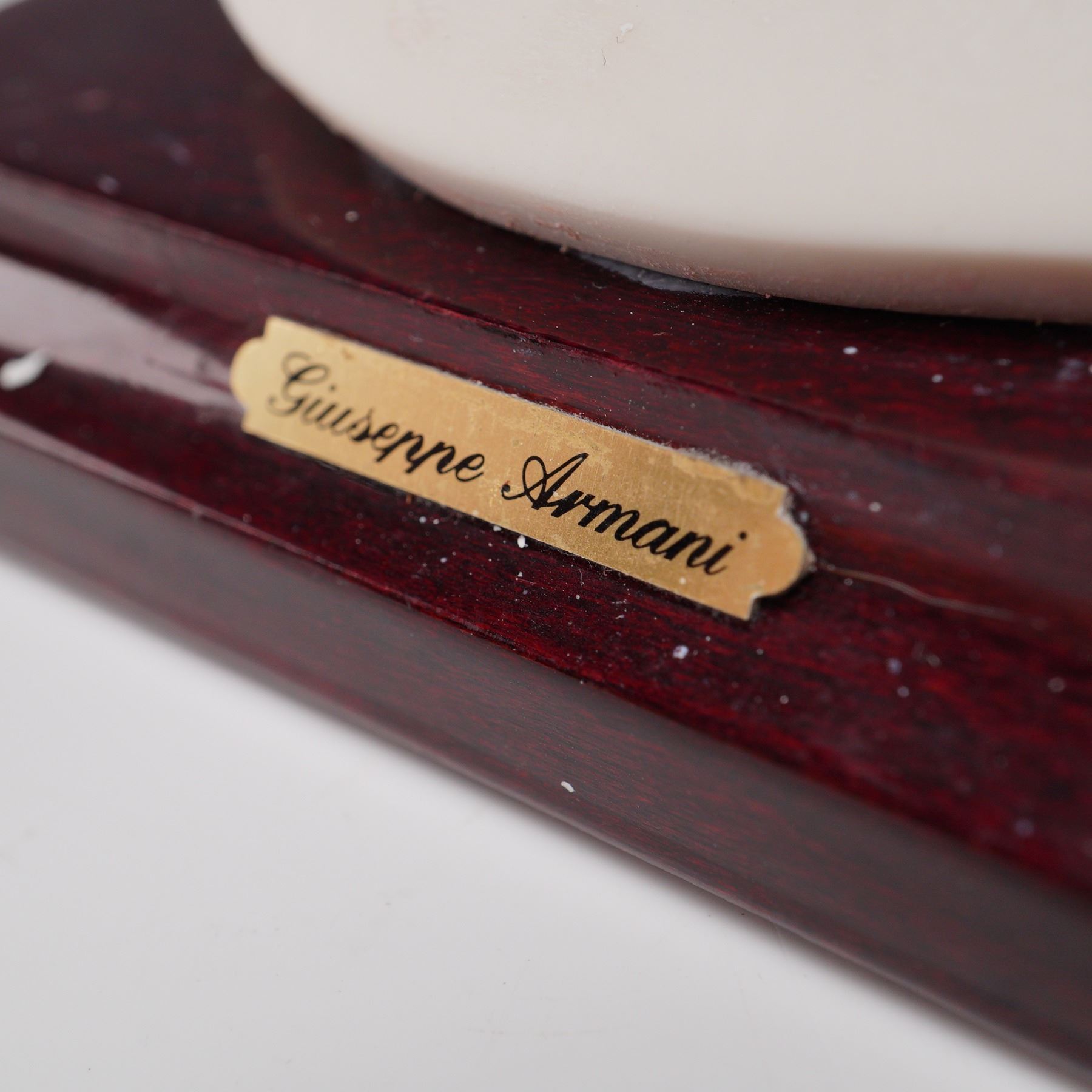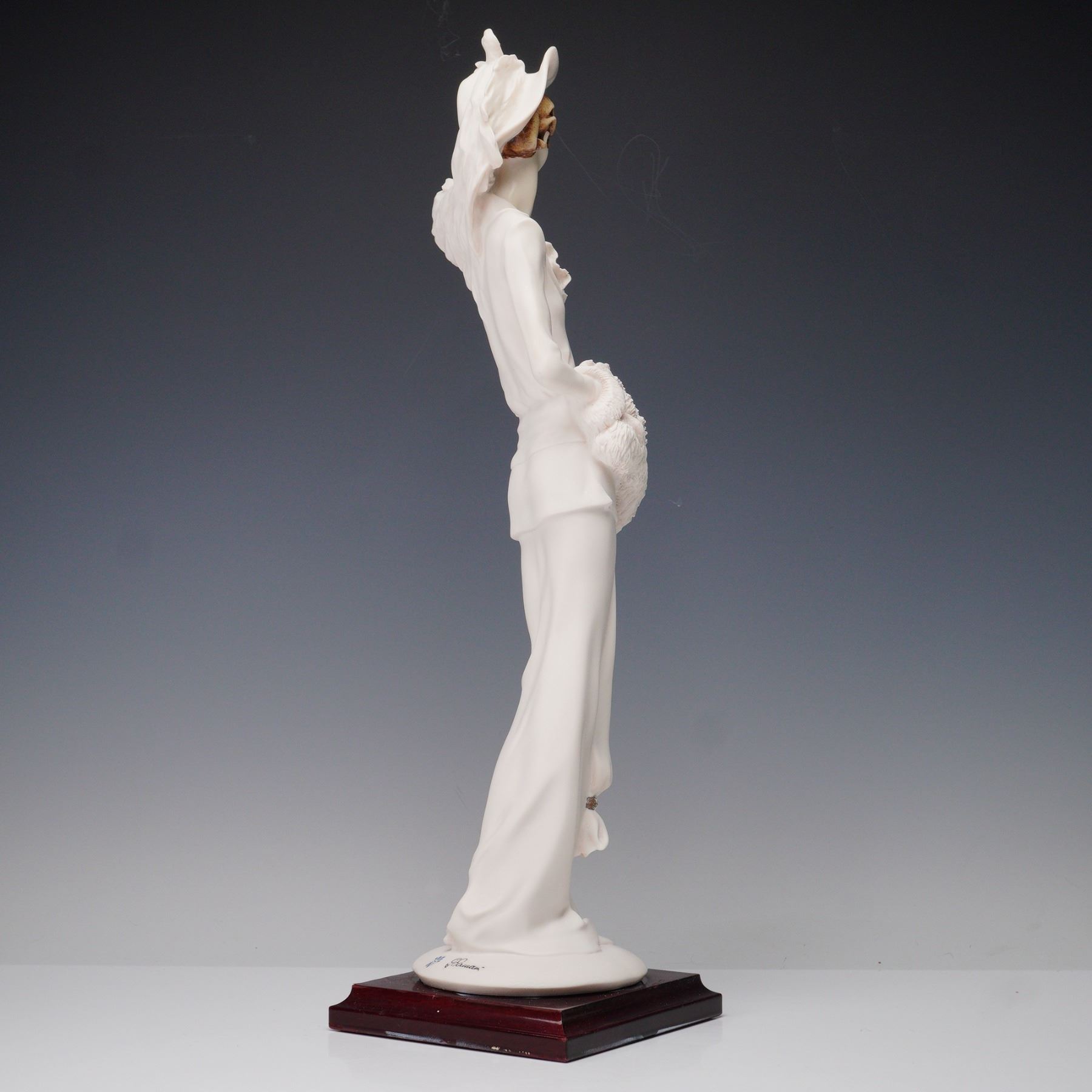 This finely crafted figurine by Giuseppe Armani for the Florence studio depicts a stylish lady in a wide brimmed hat holding a fur muff. The piece shows Armani's trademark attention to detail, from the delicate facial features to the flowing lines of her attire. It is signed G. Armani and dated 1987, impressed with the Florence mark, and also carries the blue N Capodimonte mark. The figure is mounted on a polished wooden plinth with a gilt nameplate. A desirable collectible that combines Armani's artistry with the tradition of Florence Capodimonte sculpture.