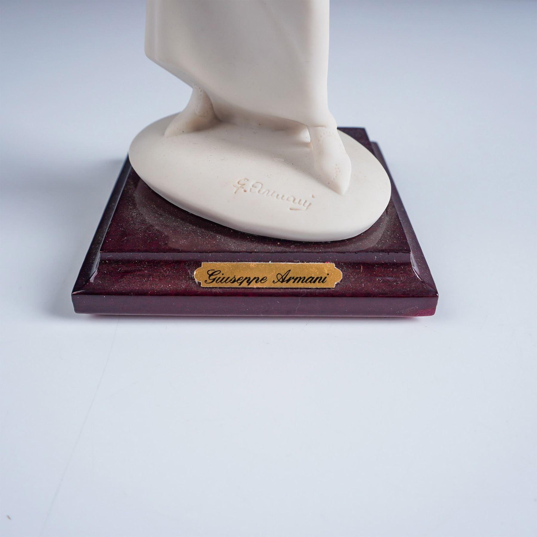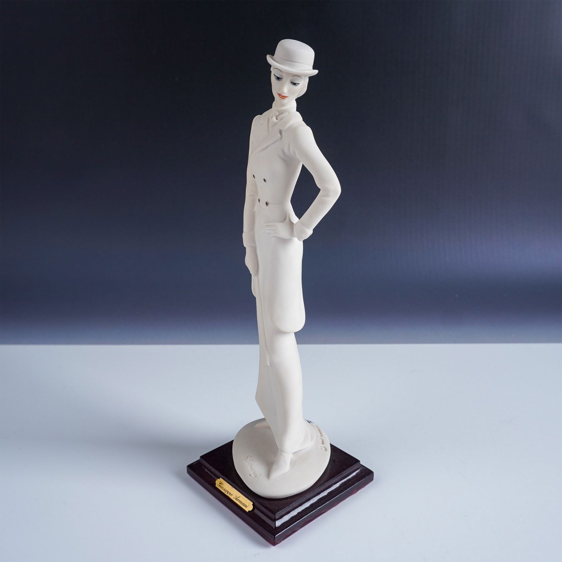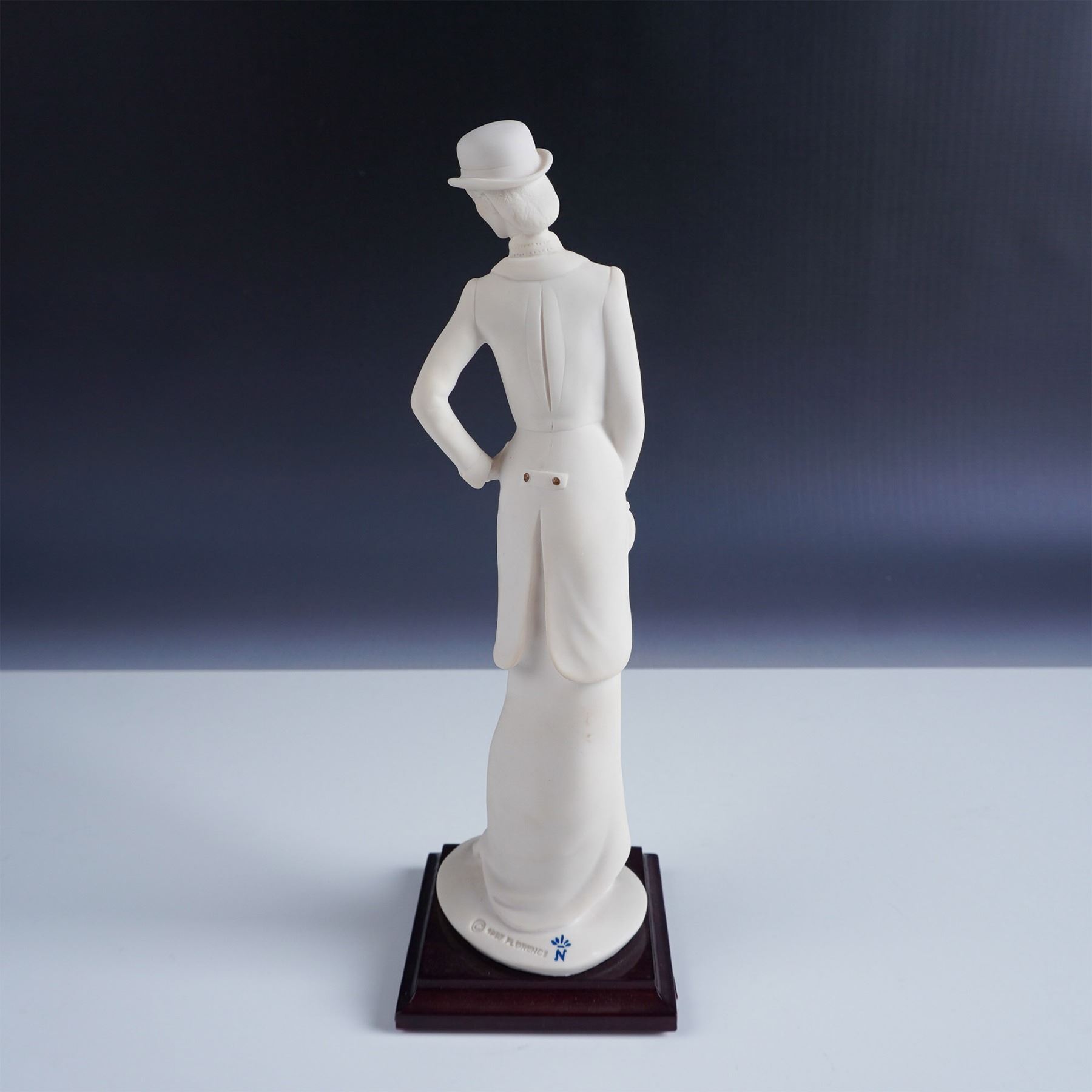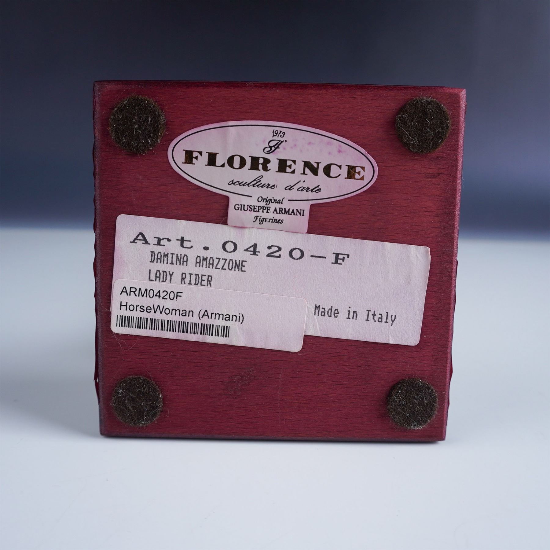 This elegant figurine, titled Lady Rider (Damina Amazzone), is an original creation by renowned Italian sculptor Giuseppe Armani. Made in Italy and produced by Florence Sculture d'Arte, this exquisite piece features a refined woman dressed in equestrian attire, complete with a riding crop and hat. The sculpture showcases Armani's signature attention to detail and sophisticated style, and it rests on a wooden base with a nameplate. The base is marked with the original Florence label and the figurine bears Armani's signature.