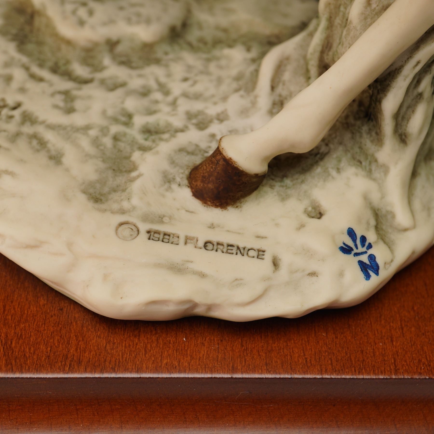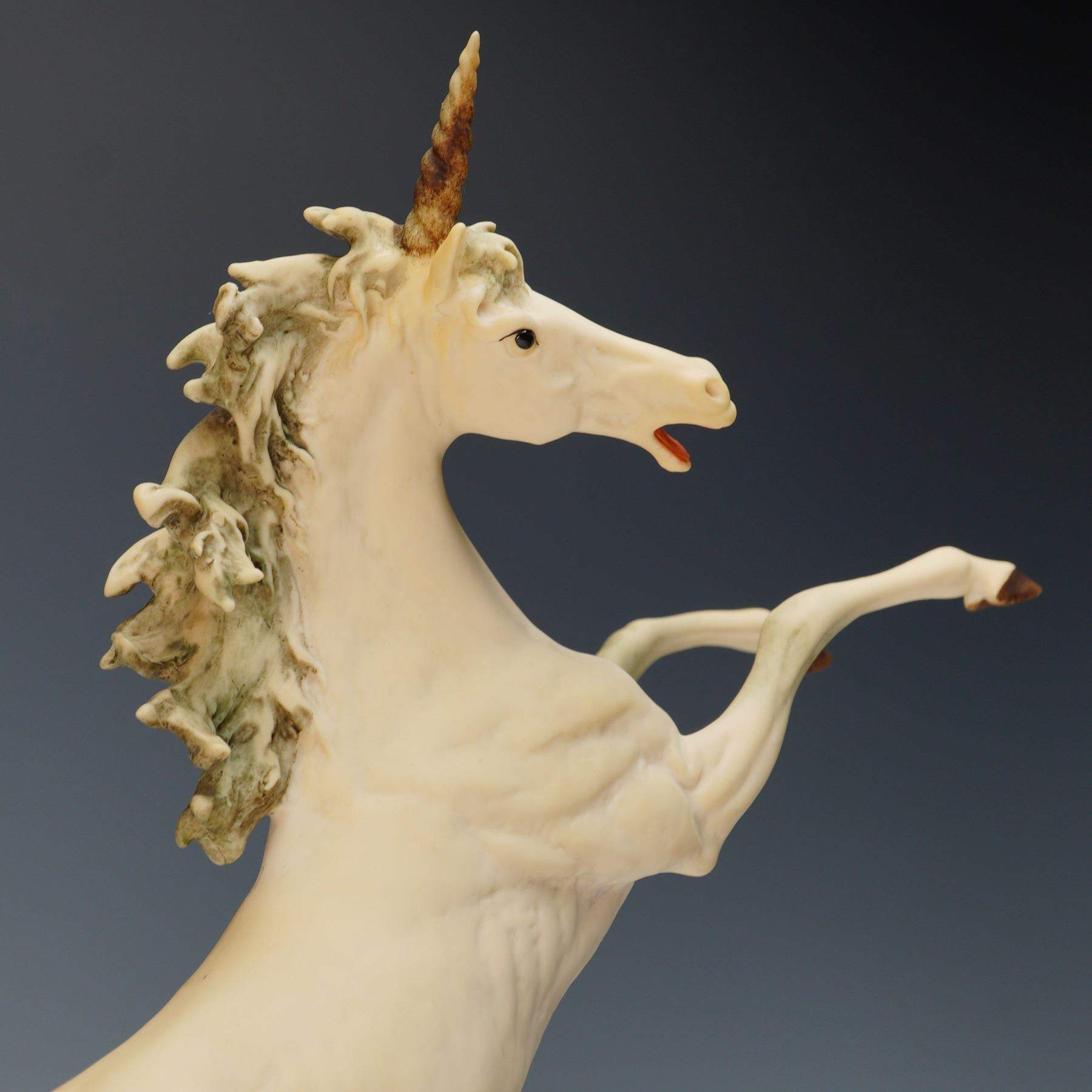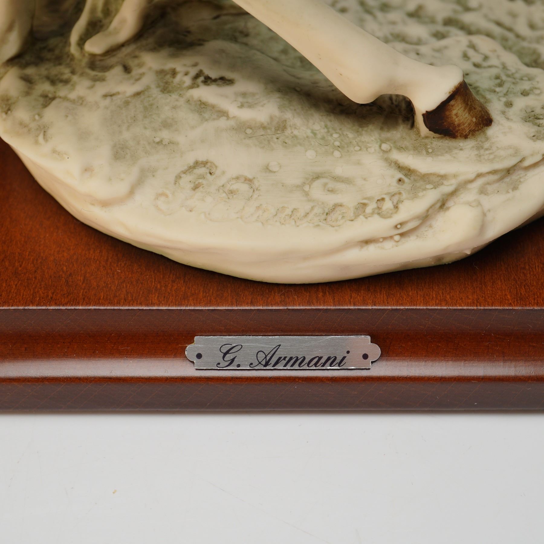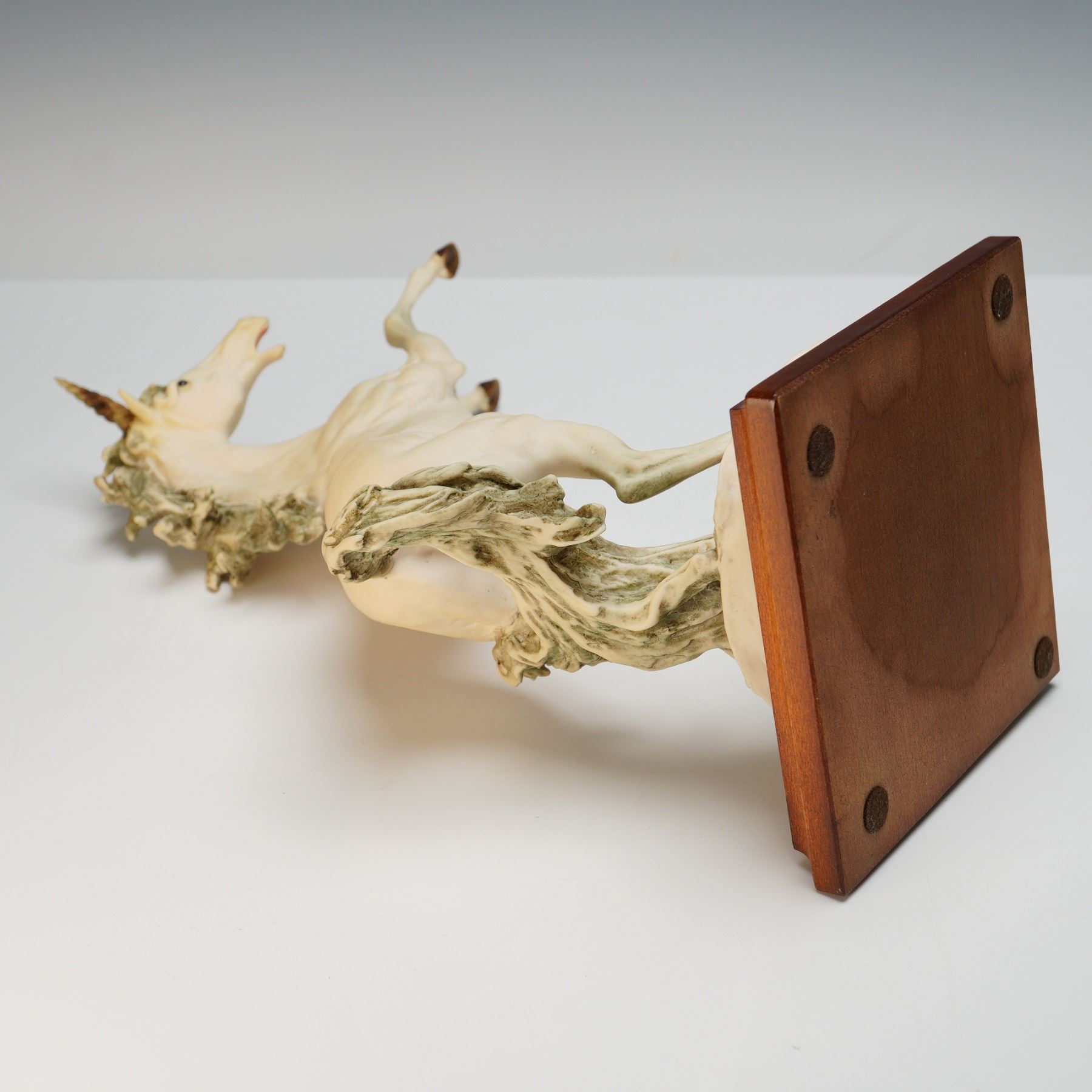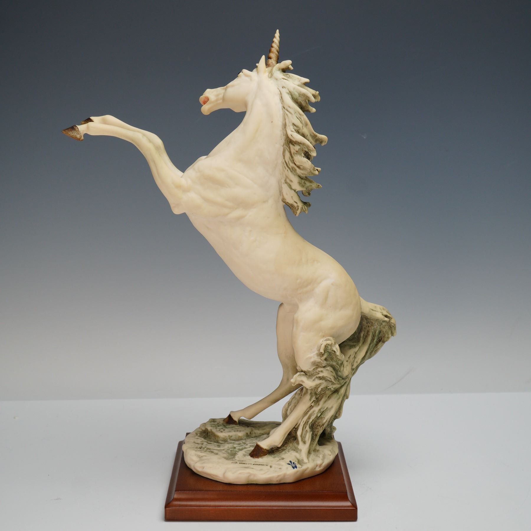 Large porcelain figurine designed by Giuseppe Armani depicting a powerful unicorn rearing dramatically on its hind legs with flowing mane and tail. The sculpture is signed G. Armani on the base and marked 1982 Florence with the Florence blue stamp. Mounted on its original wood base with metal nameplate. This piece showcases Armani's characteristic movement and detail, capturing both elegance and fantasy.