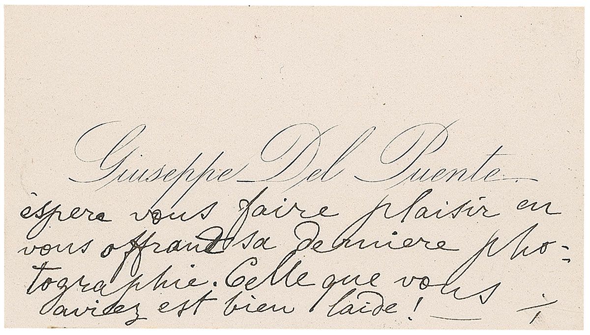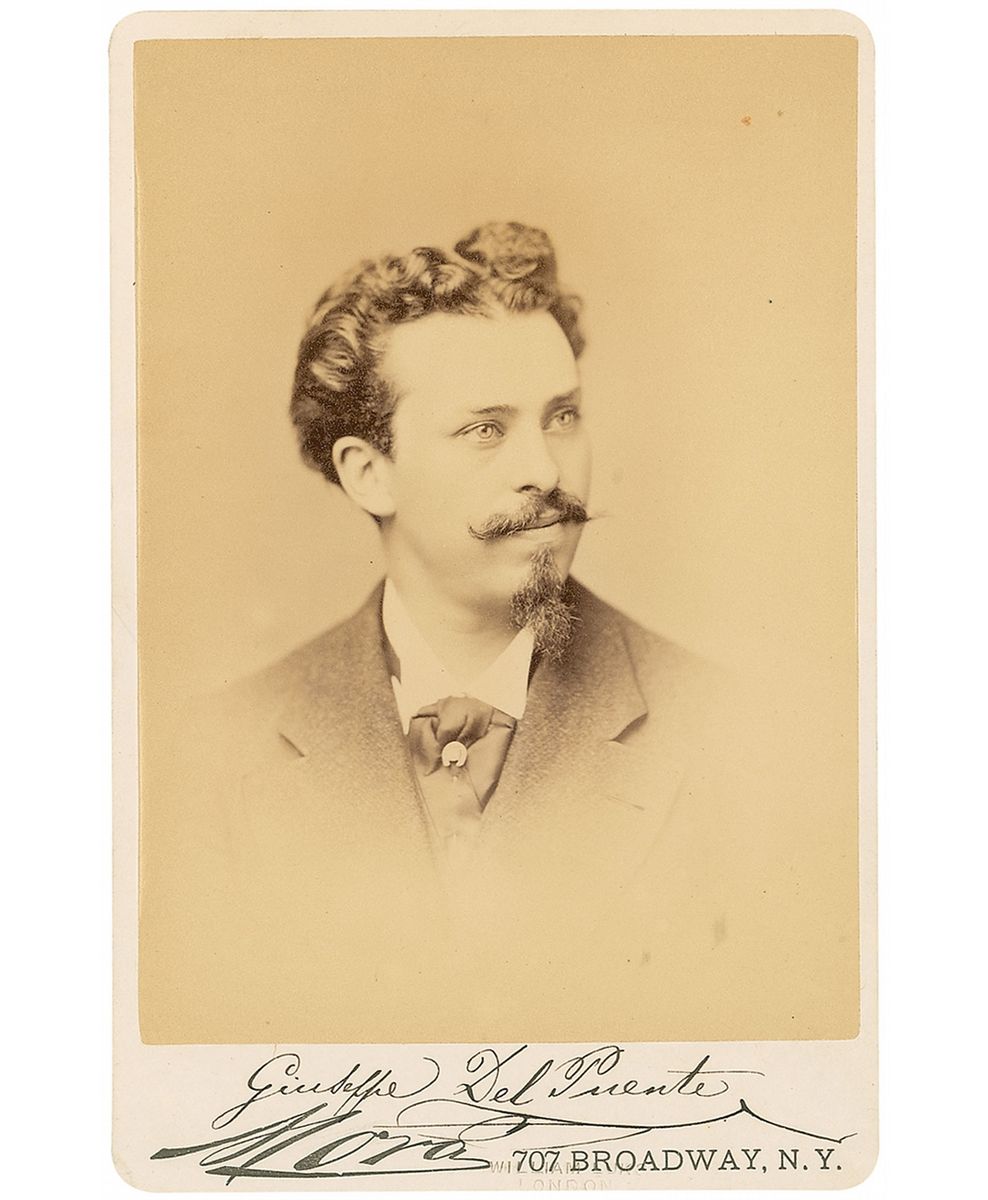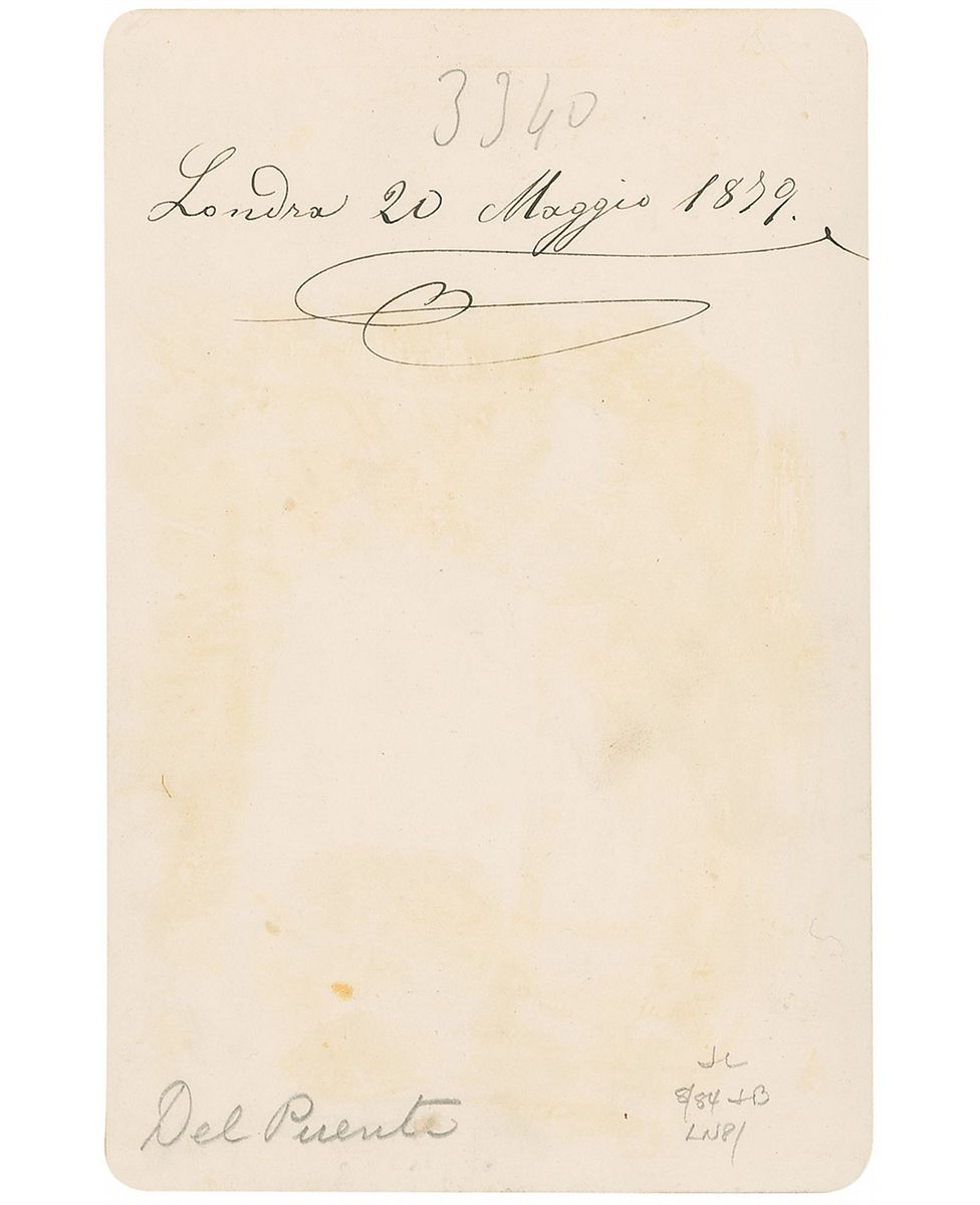 Italian operatic baritone (1841–1900). Original 4.25 x 6.5 cabinet photo by Mora of New York, signed in the lower border in black ink, and dated on the reverse by Del Puente, May 20, 1879. Also included is his personal calling card, 3 x 1.75, bearing an autograph note in French, in full (translated): “I hope you will get pleasure from my offering this, the last photograph that I have. The one you have is very unattractive.” In fine condition.