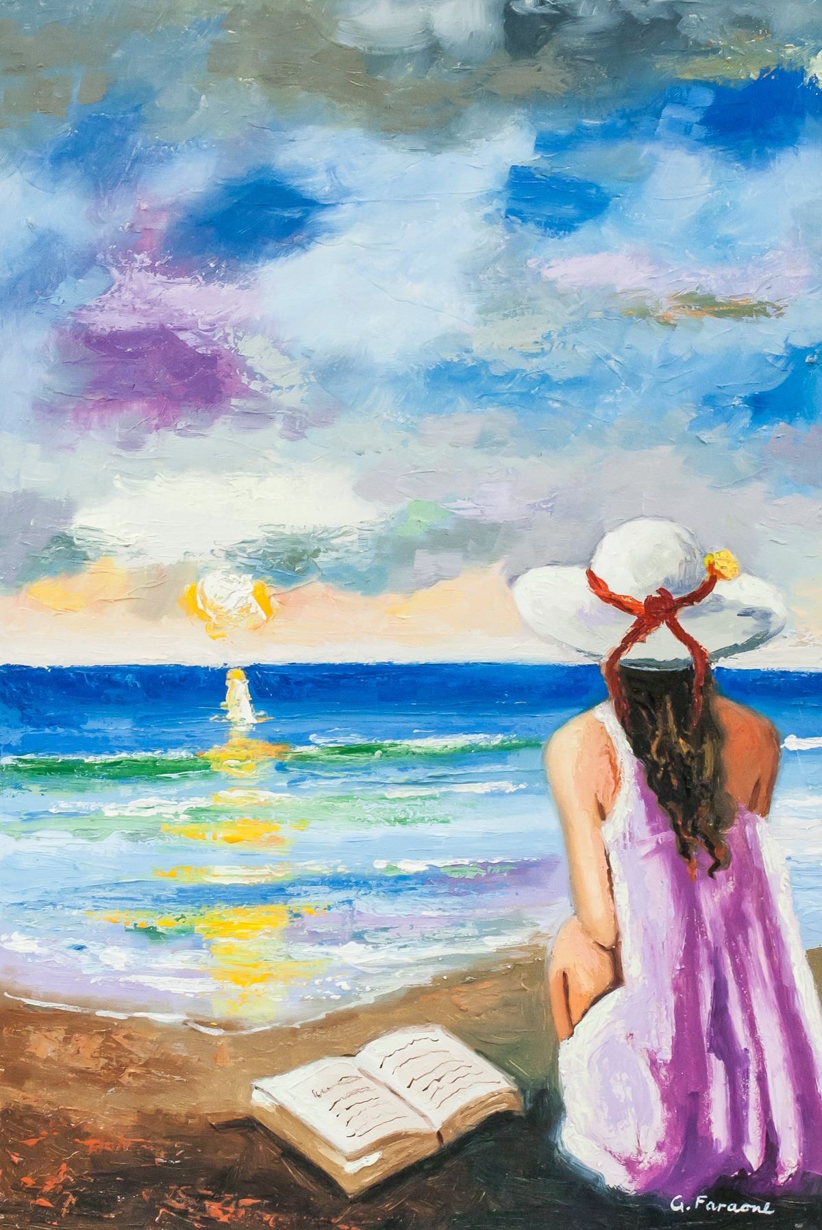 Oil on canvas. Featuring a woman sitting by the beach watching the sunset with an open book on the sand beside her. Signed "G. Faraone" in the bottom right corner. Label affixed to verso reads "W. Russell Button, Inc. FORMERLY OF ACKERMANN'S 408 South Michigan Avenue, Chicago GIUSEPPE FARAONE GIOVANE CHE GUARDA IL MARE 1954". Stamped with "ORIGINE GARATINE ART.ORG.ES", "Galerie Beyeler Paris", "Galerie Mathias Fels PARIS", and "GALERIE LOUISE LEIRIS 47 RUE DE MONCEAL PARIS VIII". Attributed to Giuseppe Faraone (Italian). 60 x 40 cm (24 x 15.5 inches). Provenance: This lot carries limited provenance from a Southern Ontario estate.