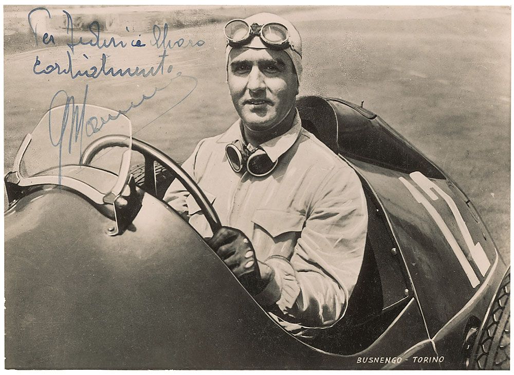 Italian race car driver (1906–1966) who was the first ever Formula One World Champion. Rare vintage glossy 5.75 x 4.25 photo of Farina posing in his race car, signed and inscribed in Italian in fountain pen. In fine condition.