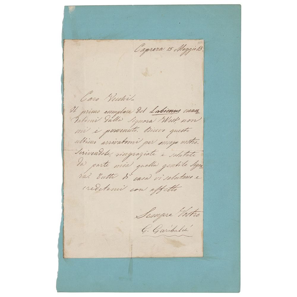 LS in Italian, signed “G. Garibaldi,†one page, 5.25 x 8.25, May 15, 1865. Untranslated handwritten letter from Caprera. Affixed to a larger sheet and in fine condition, with some light staining.