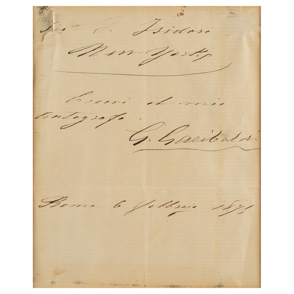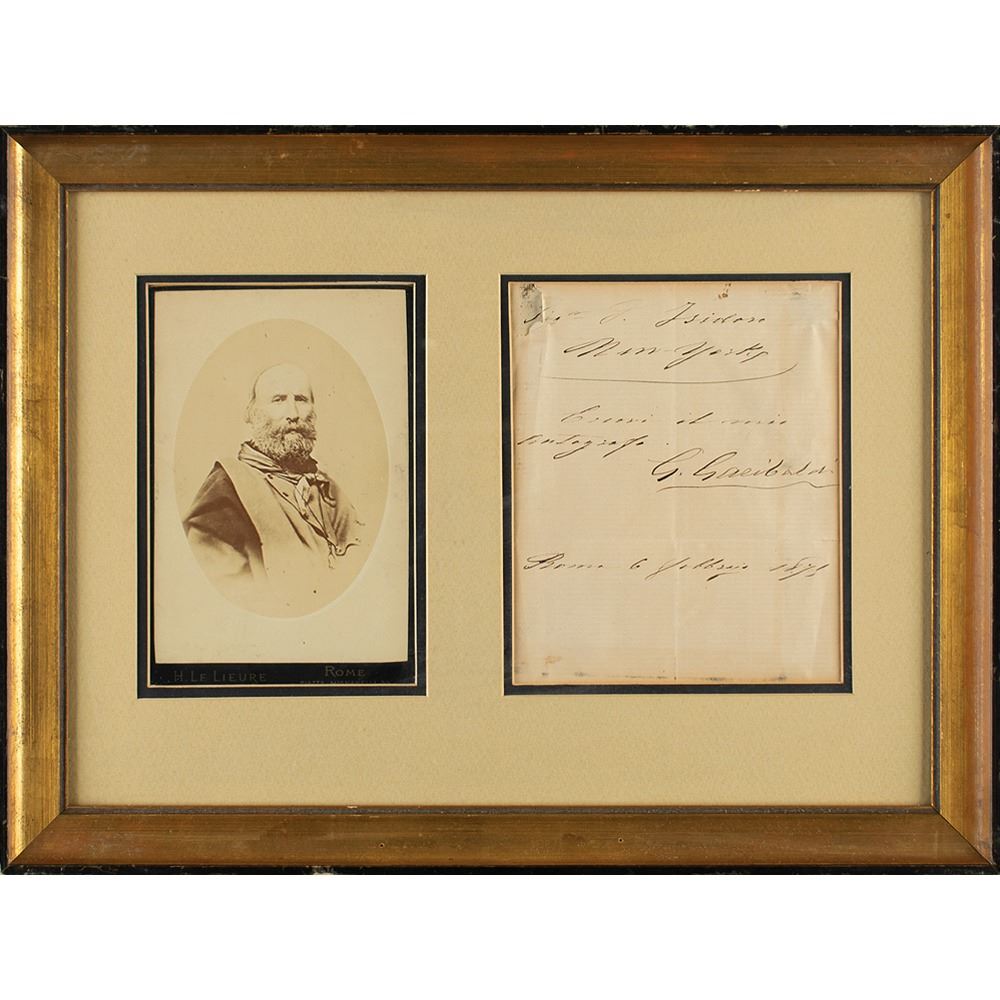 Ink signature and inscription in Italian, "Sig'r Isidoro…mio autografo, G. Garibaldi, Roma, 6 febbraio 1875,” on an off-white 5 x 6.25 album page. Double-matted and framed with an original cabinet photo of the Italian patriot to an overall size of 15.25 x 11.5. In very good to fine condition, with scattered small stains, and a tear to the upper left corner.